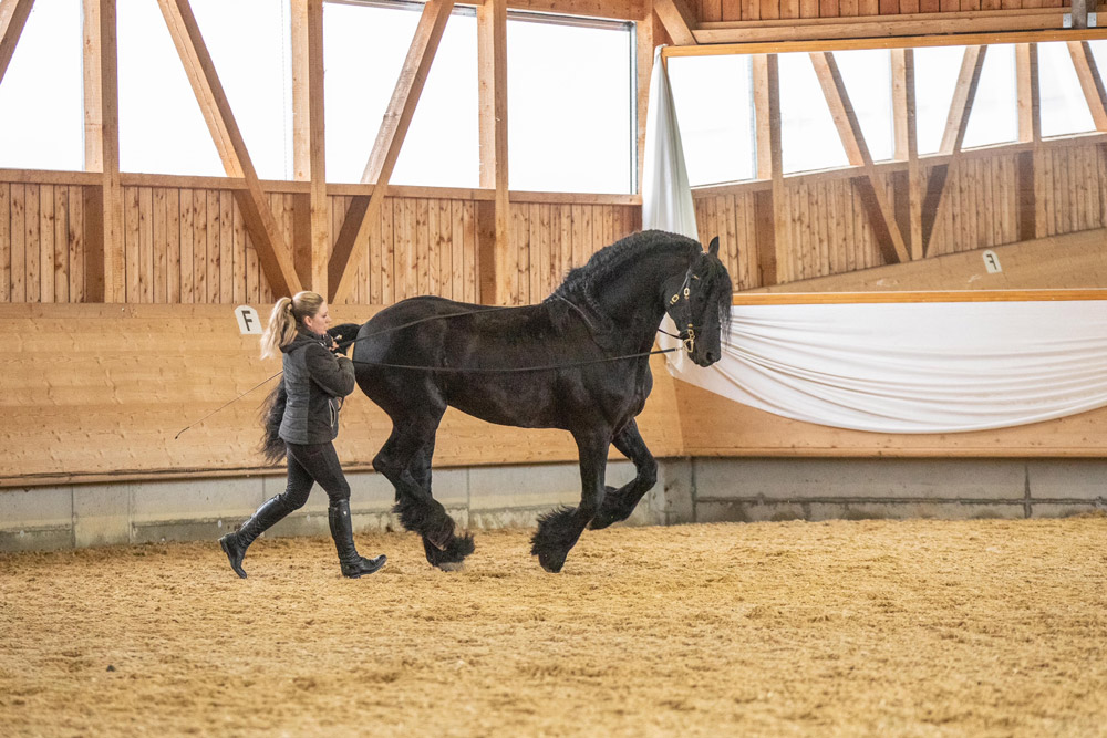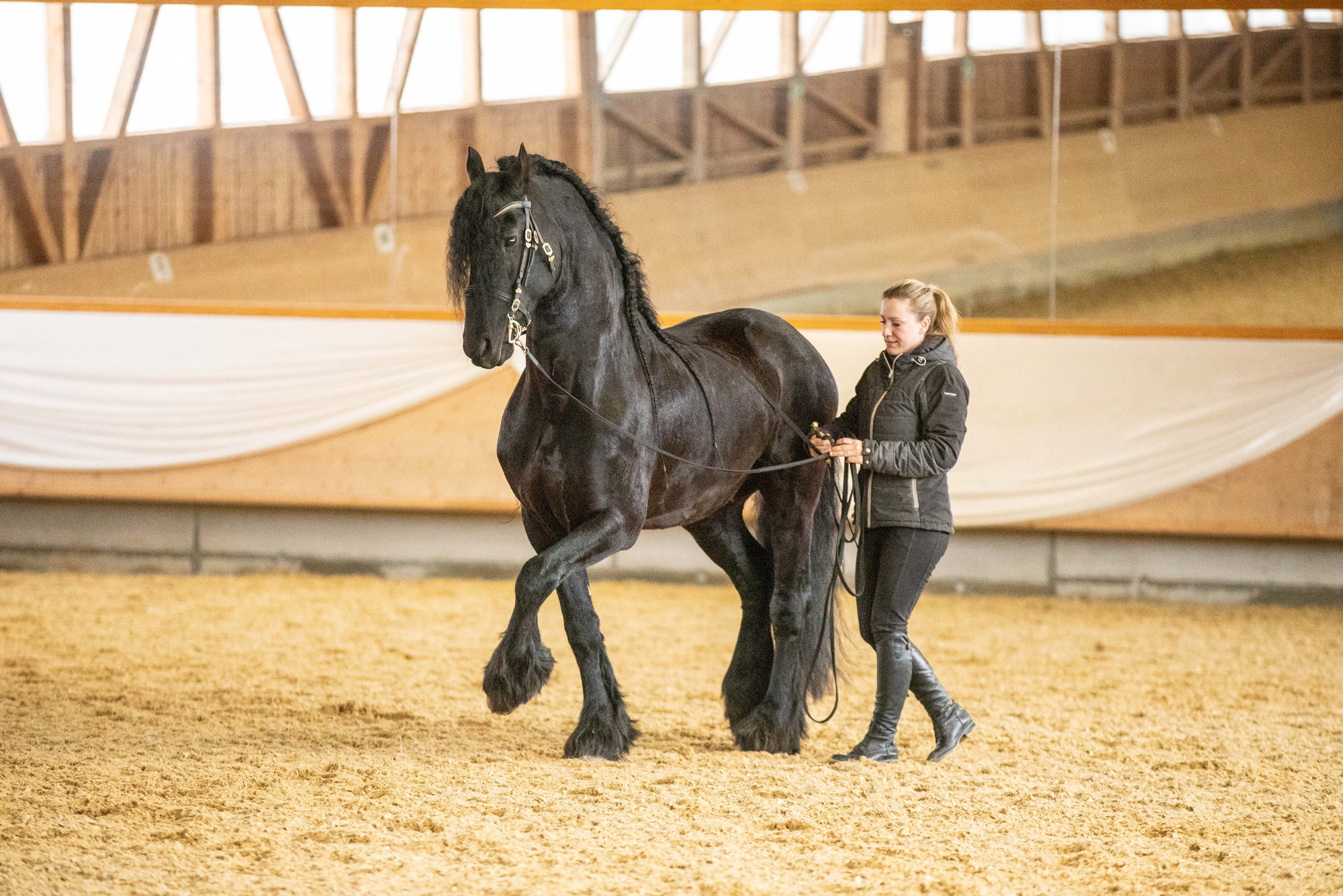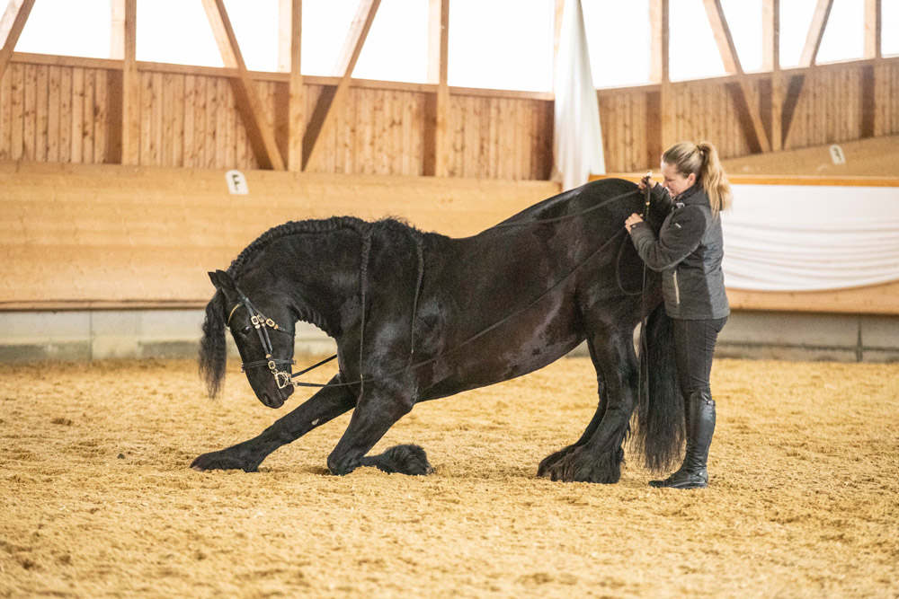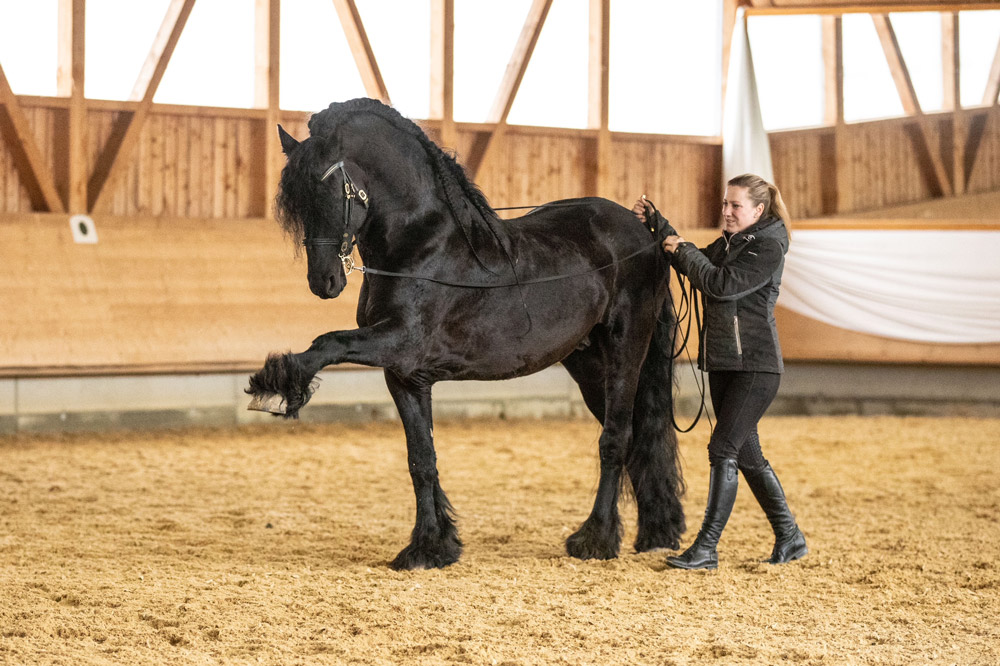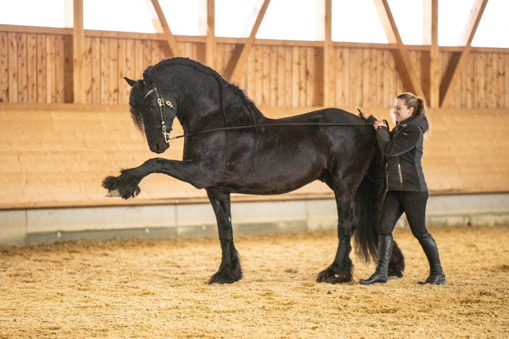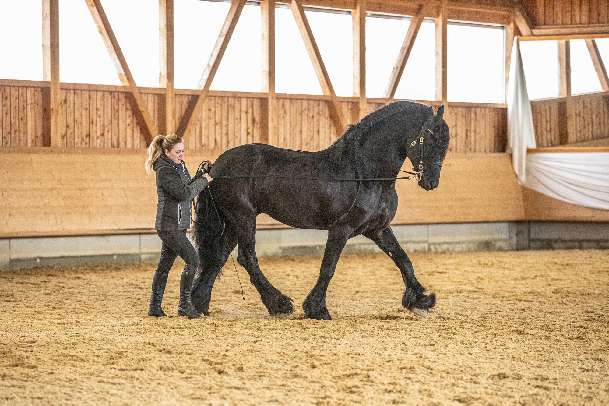 Friesenhengst CAMACHO mit Anna Kulicke bei der Arbeit am Langzügel.