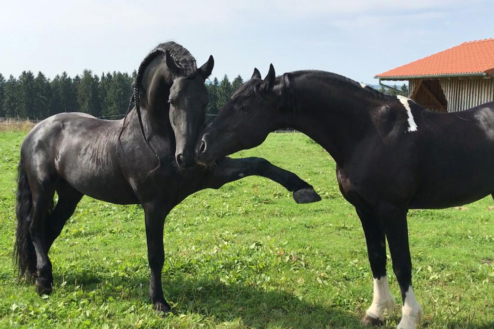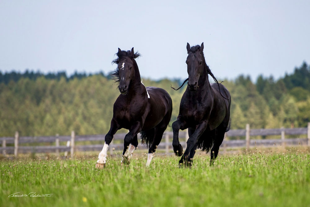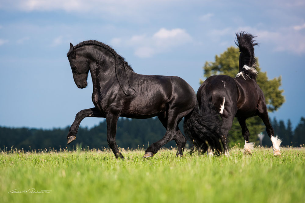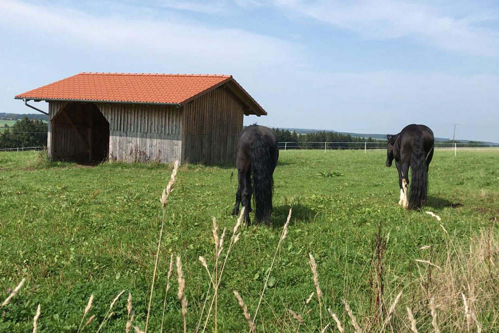 Die beiden Hengste Camacho und Django auf der Sommerweide. Jeden Morgen 2 Sekunden! lang Imponiergehabe und dann stundenlanges gemütliches Grasen :-)