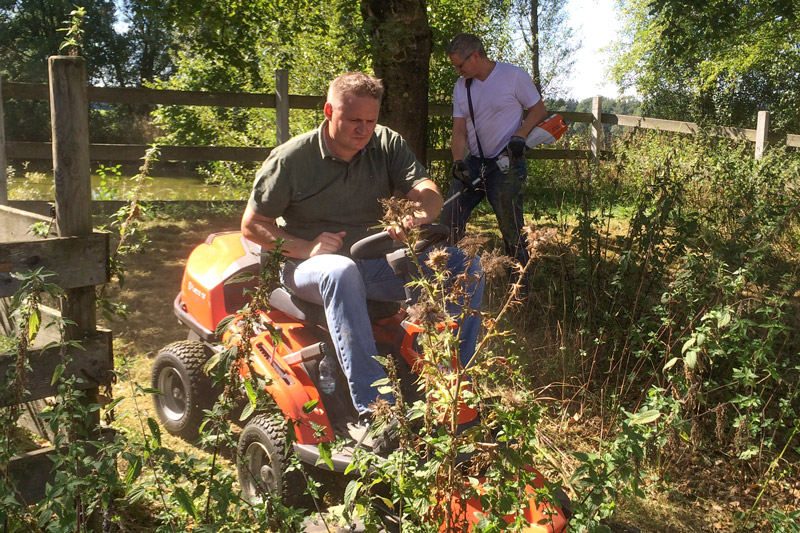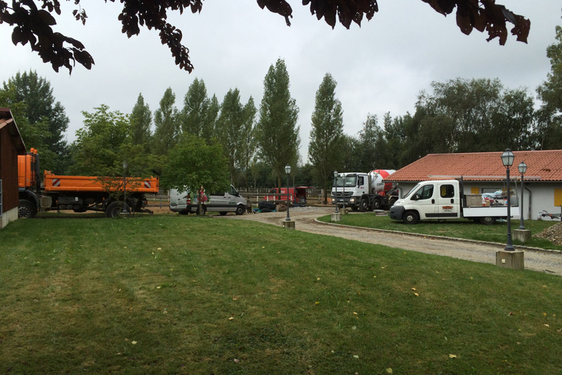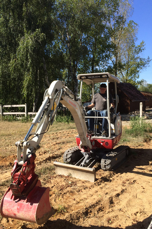 Sechs Tage die Woche befindet sich eine Fußballmanschaft von Handwerkern und Bauarbeitern am Hof, große Lkw und Maschinen, es wird gerüttelt, gebaggert, gebohrt, geschraubt, betoniert, Rohre und Leitungen verlegt. Höchstleistung für alle! Keine Kosten und Mühen werden gescheut, aus der traumhaften Anlage ein Paradies zu schaffen. Einweisung in all die neuen Maschinen und Geräte – ob Traktor, Bewässerung, Rasenmähertruck u.v.m. – wir arbeiten 16 Stunden und teilweise wachsen alle über ihre Kräfte hinaus.