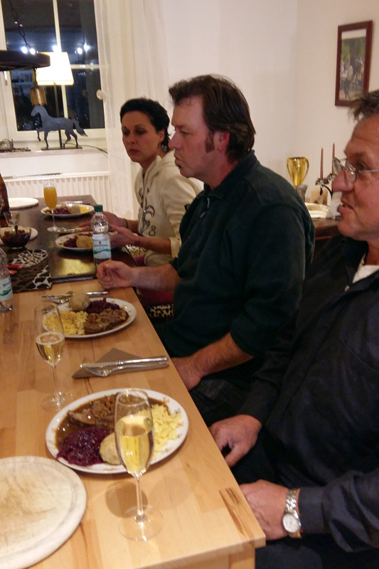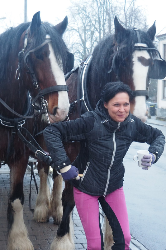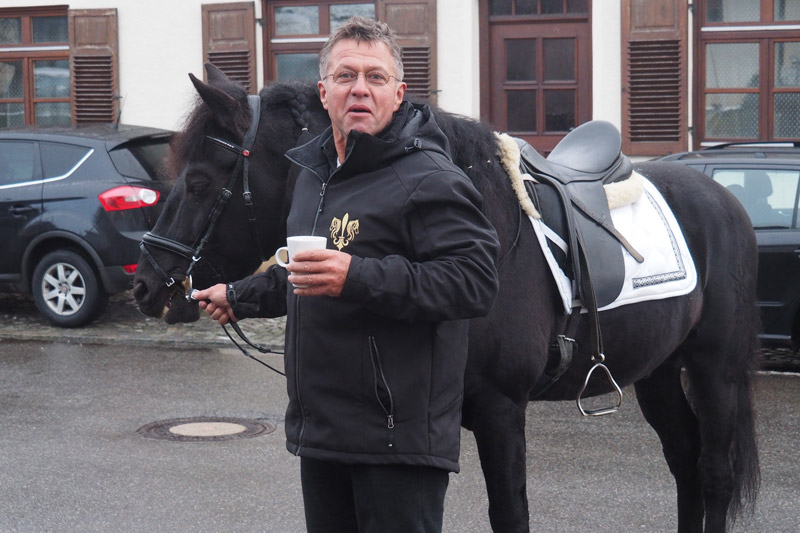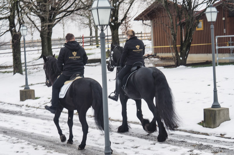 Trotz Schneesturm und düsterem Wetter kam Urs aus der Schweiz angefahren mit großem Gefährt und Yassi ahnte nichts! Susanne ist auf ihrem Friesenhengst Ryan vorne weg geritten, unser "Mann für alle Fälle", Horsti, mit PRE-Hengst Negrito neben ihr – so sind wir mit der Cinderella-Kutsche und den Big Boys durch unseren Ort gefahren, haben Glühwein und selbst gebackene Plätzchen bei der Bäckerei Mang beim Zwischenstop bekommen und hatten einen wunderschönen Tag auf Fleur de Lis. Am Abend bekochte uns der befreundete Jäger mit Wild, selbstgemachten Spätzle und Knödel, es war traumhaft. Gutgelaunt feierten wir dann noch ein wenig!