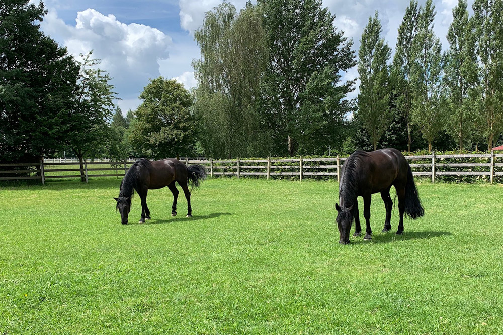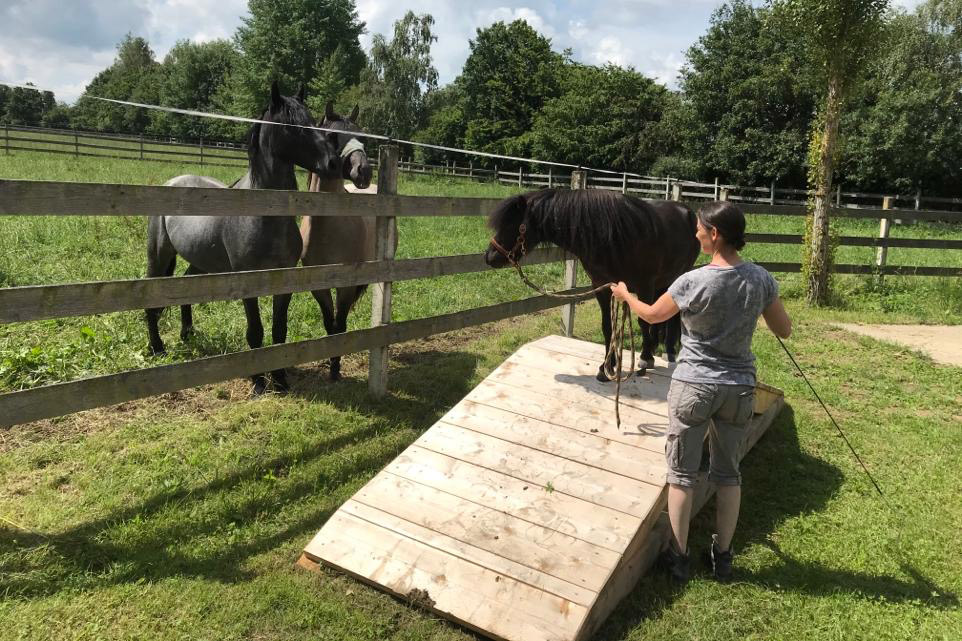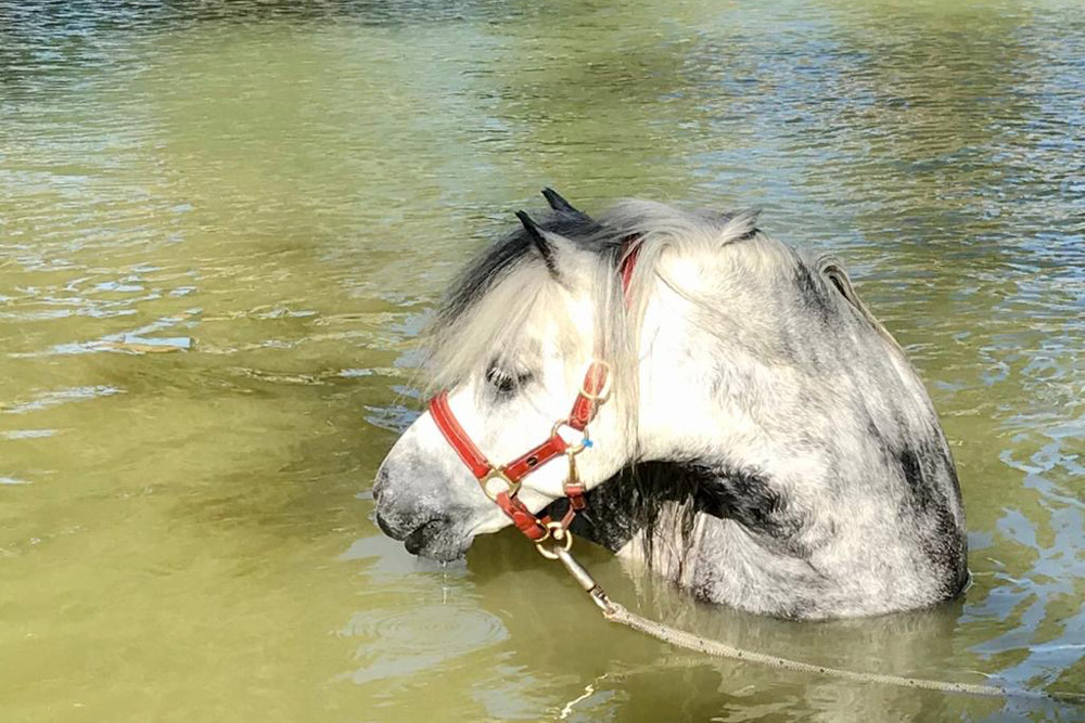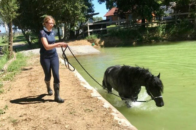 Zwischen den Reiteinheiten konnten sich Mensch und Tier auf unserem Natur Trail, den Gastkoppeln oder im Teich vergnügen. Ganz besonders unser „Wasser catwalk“ kam bei den hochsommerlichen Temperaturen bei allen sehr gut an.