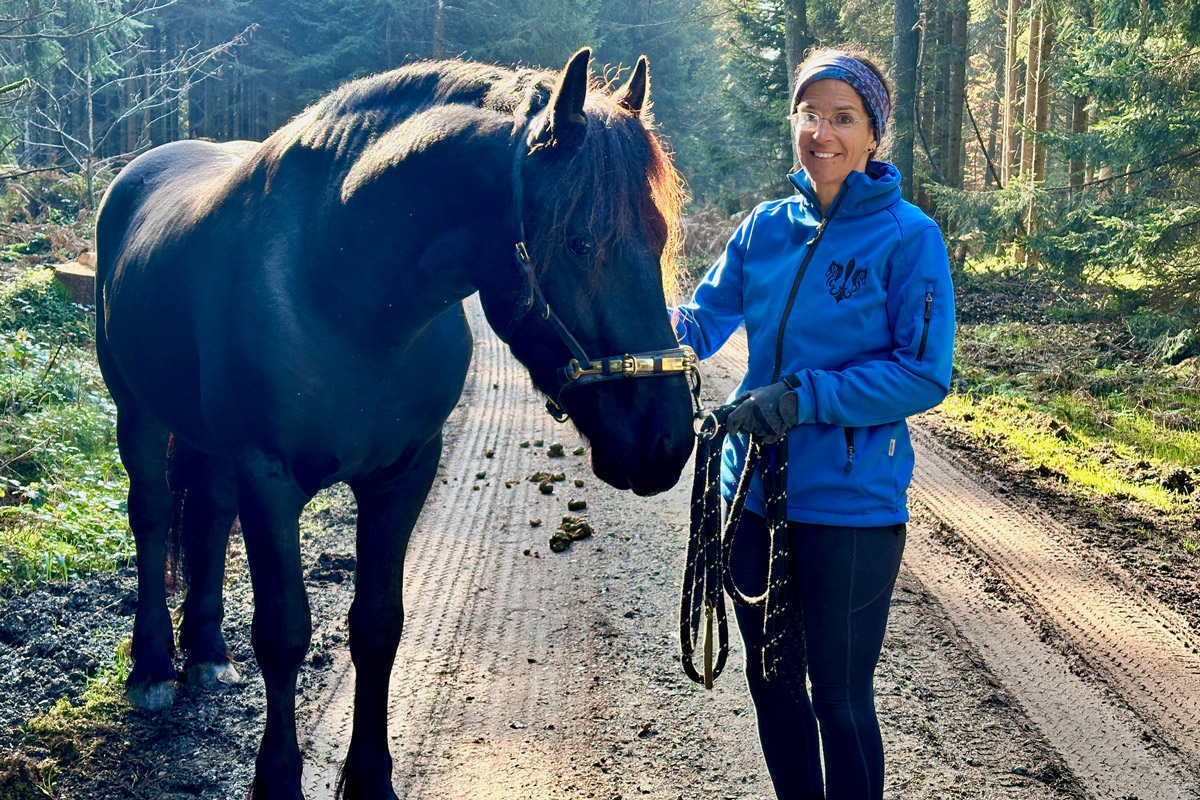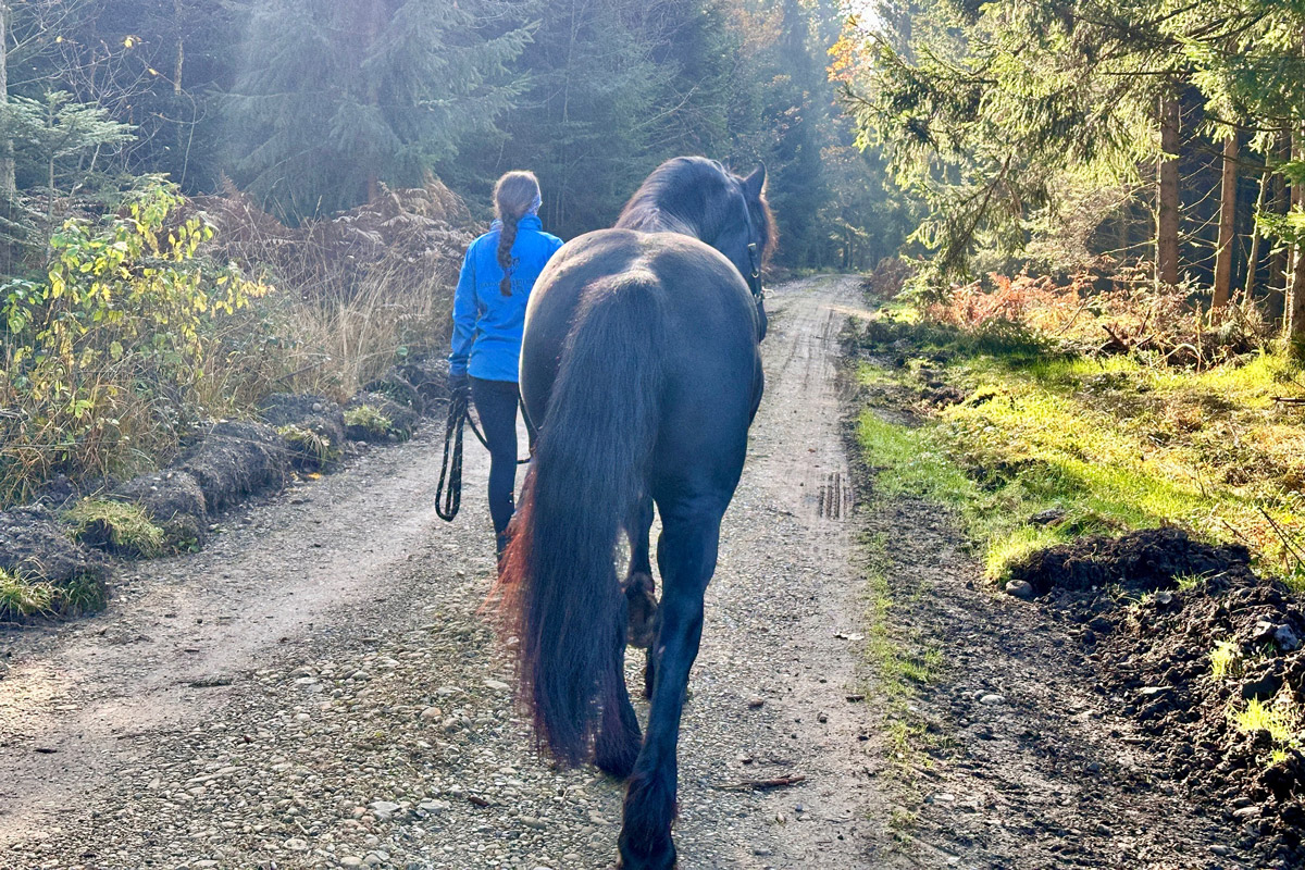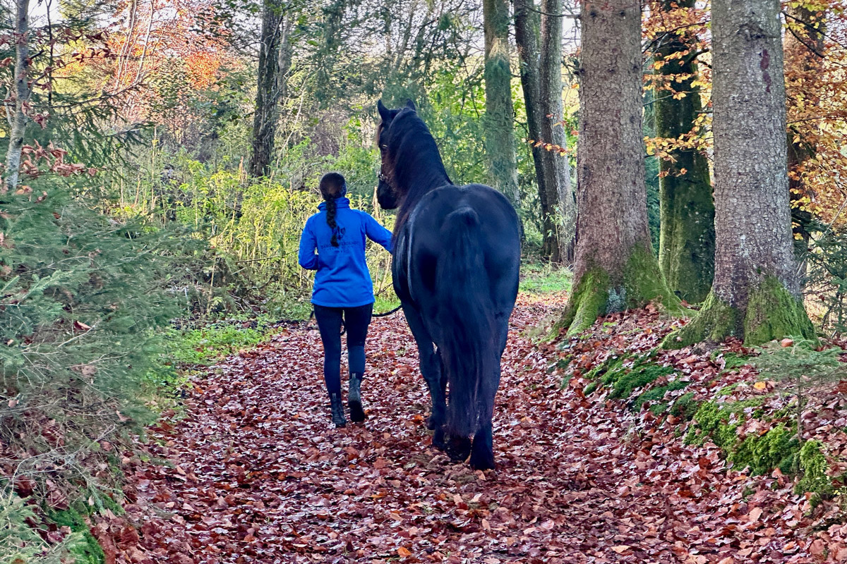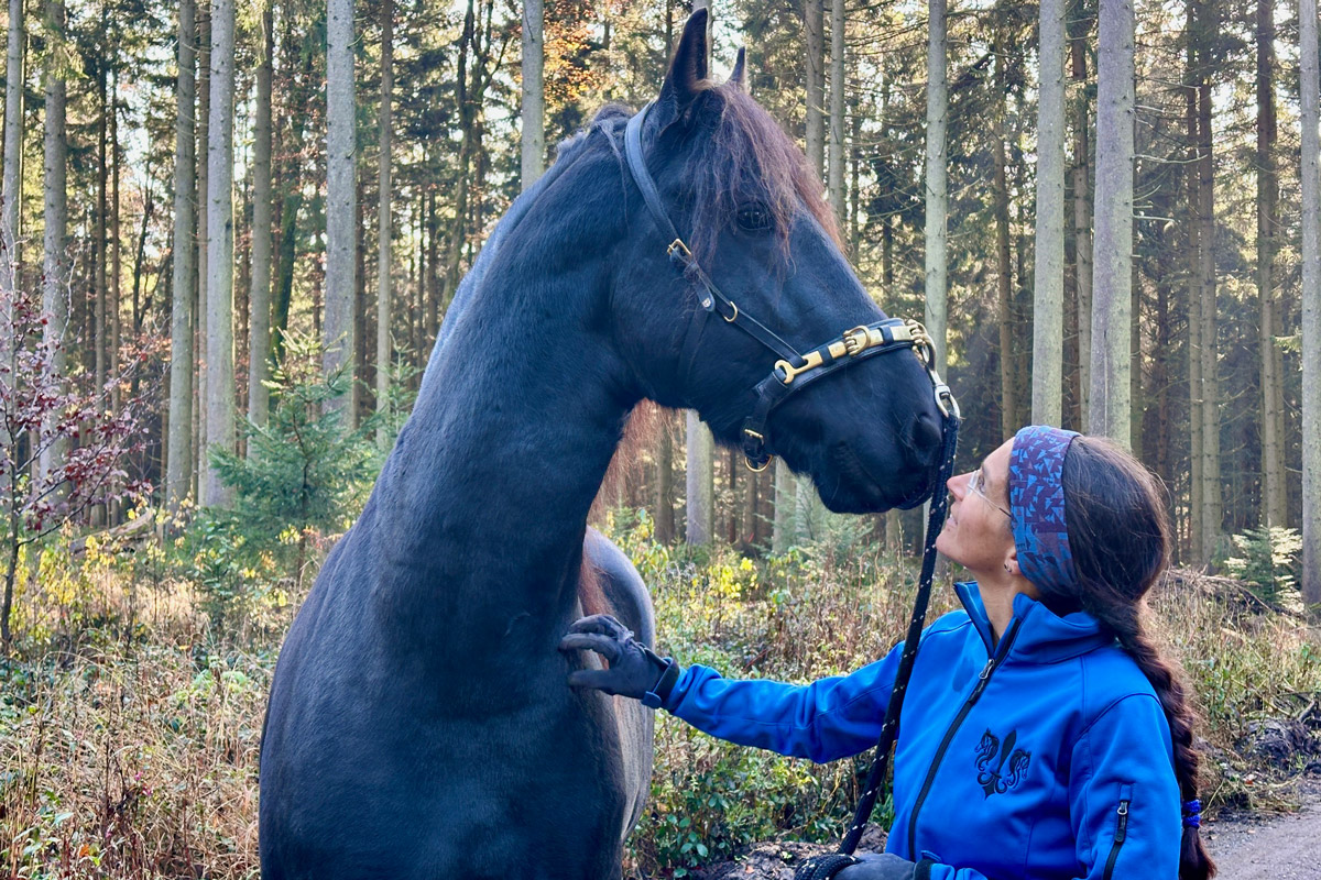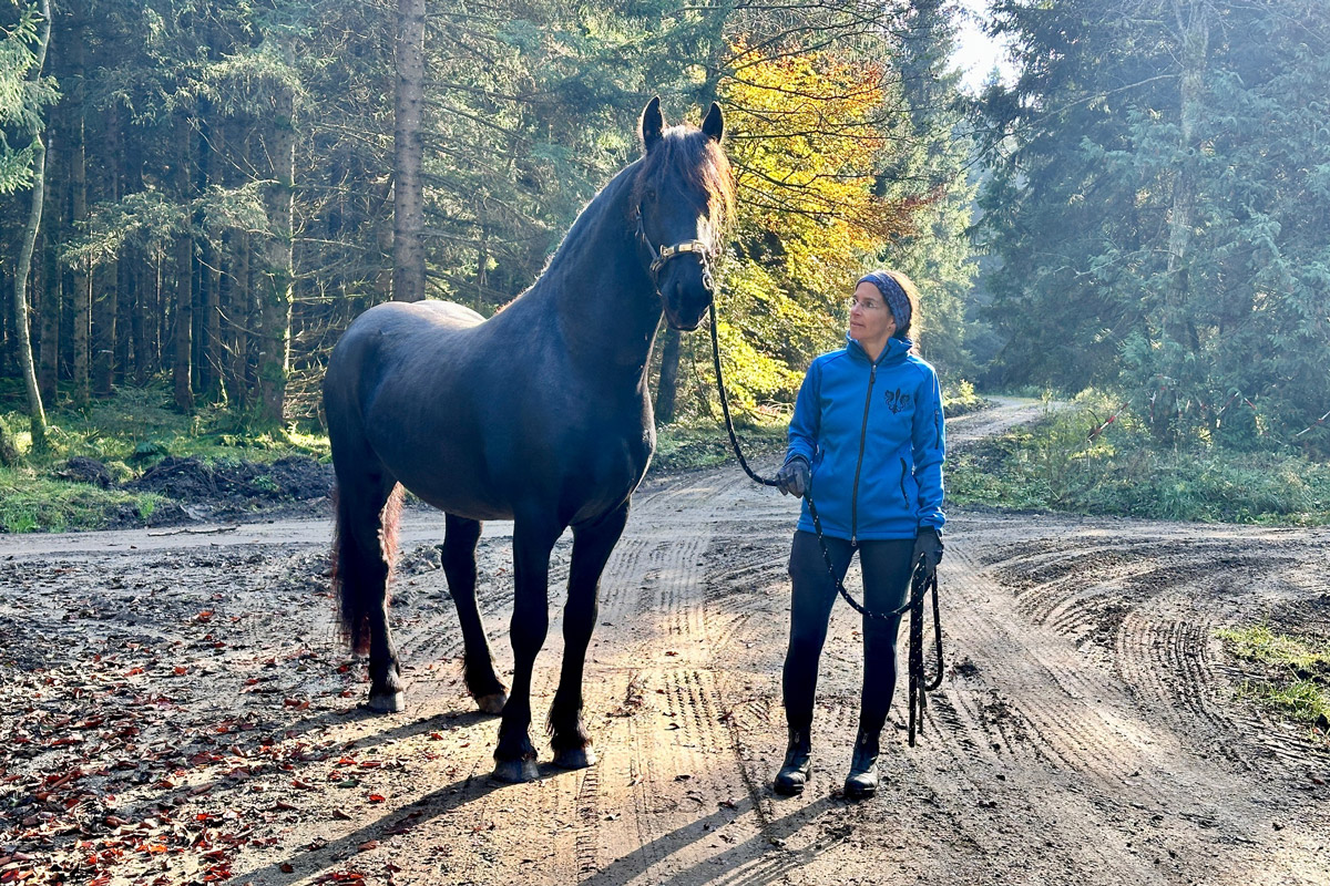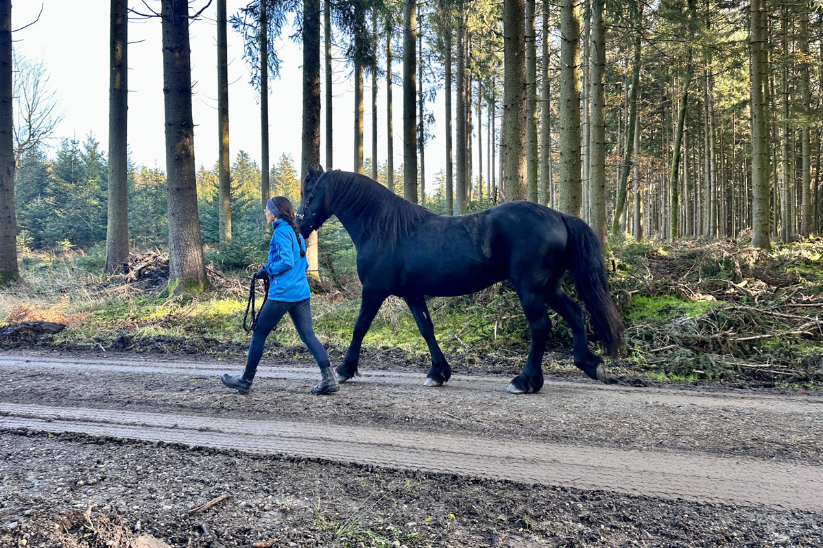 Unser 3jähriger Friesenhengst PRIAMOS (Tiede 501 x Sipke 450) darf die große, weite Welt entdecken. Der erste Spaziergang außerhalb unserer Anlage war total entspannt. Er war super brav und cool und zu jeder Zeit immer ganz bei Gise. Tolles Pferdchen!