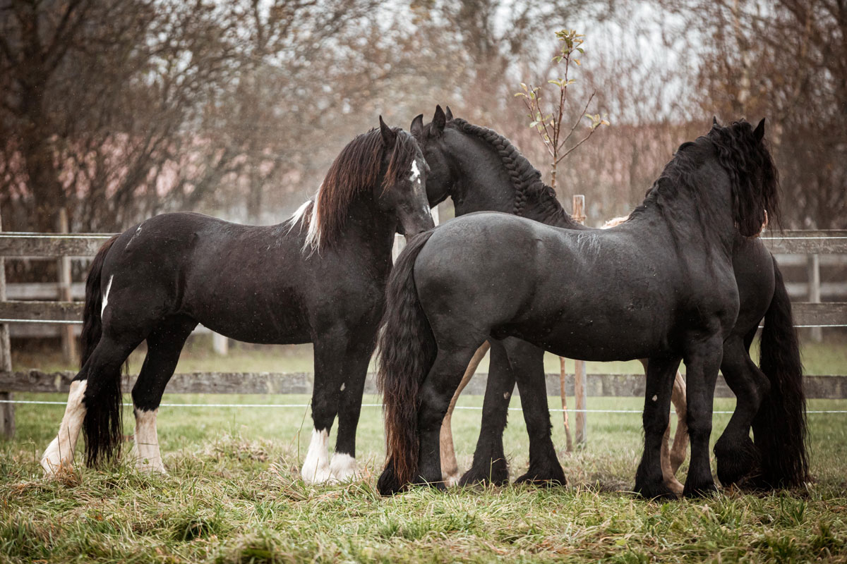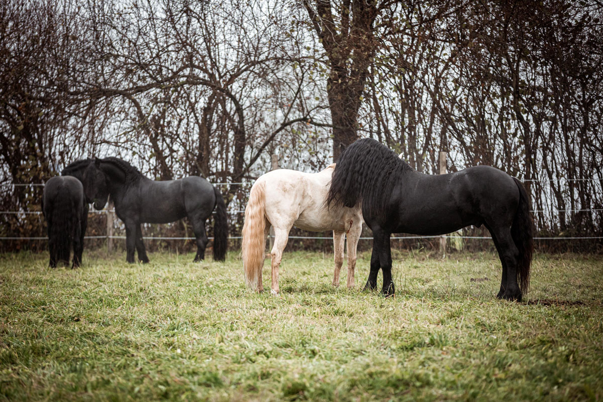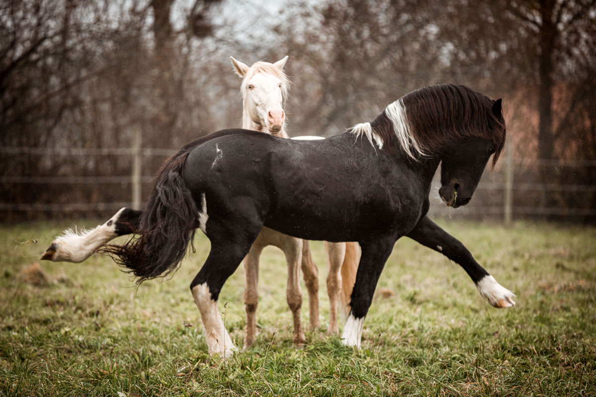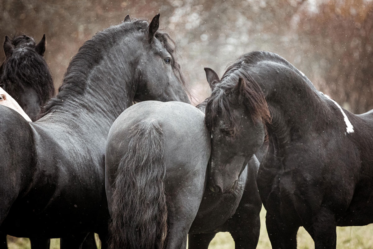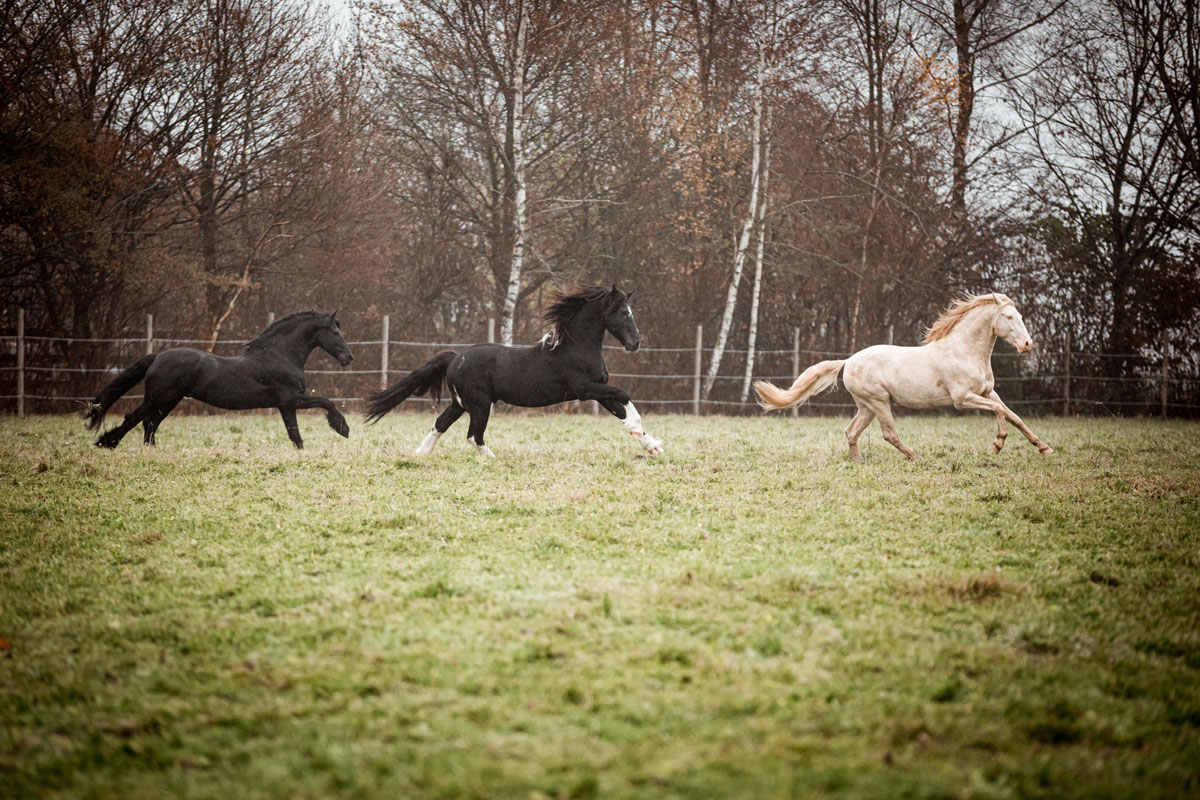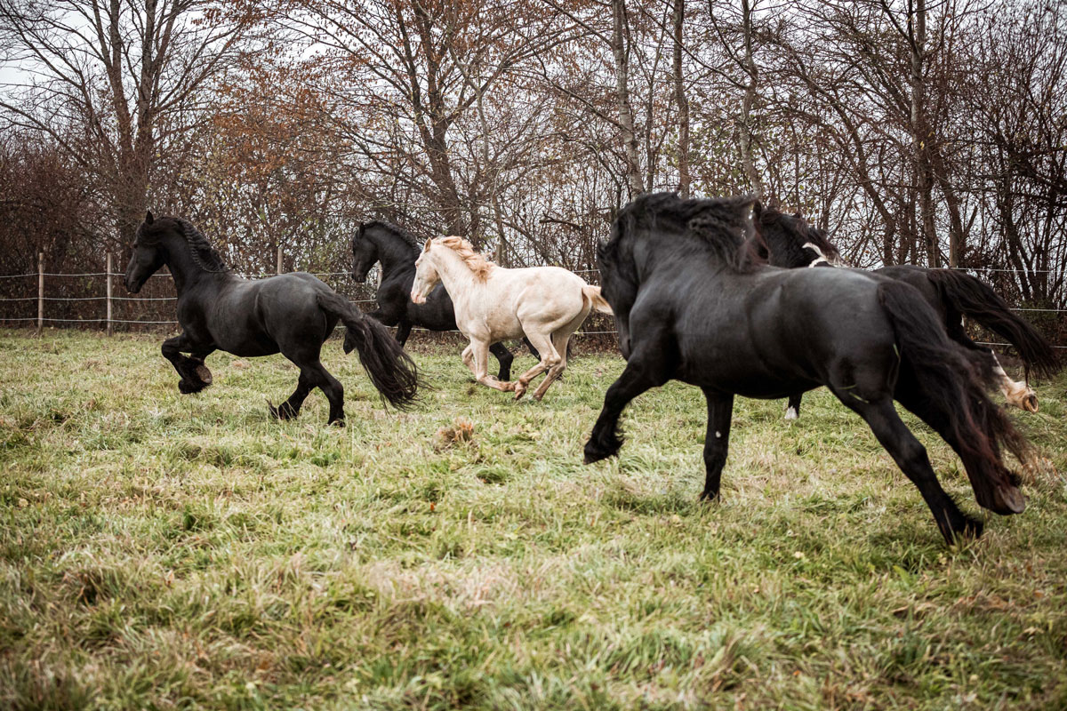 Die fünf Hengste (Django, Oceano, Rein, Da Vinci und Camacho) haben bei kalten Temperaturen, Nieselregen und Wind richtig Spaß auf der Koppel.
