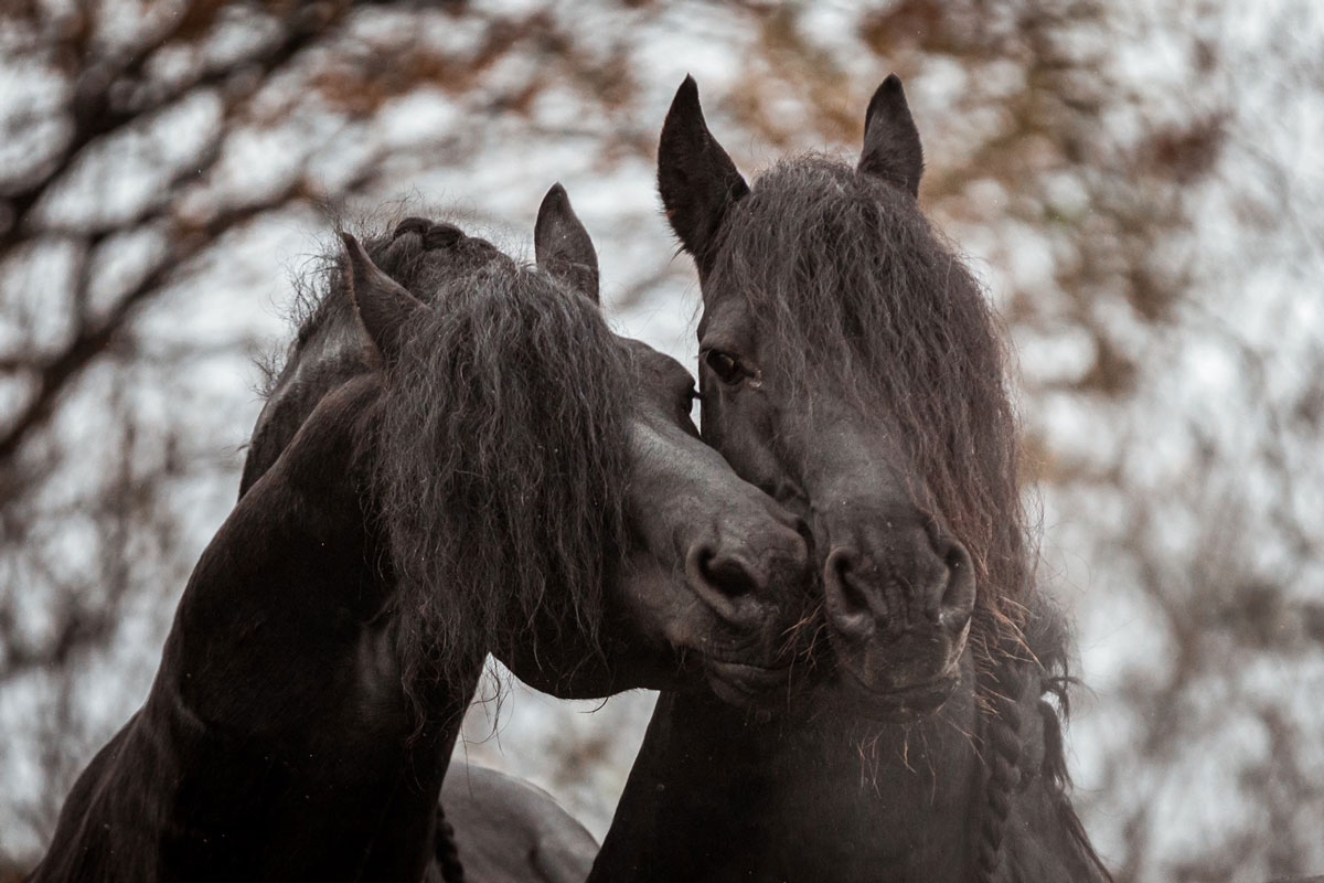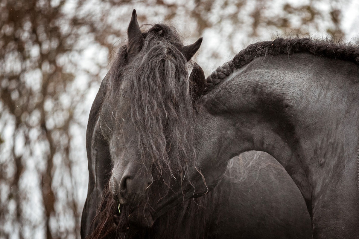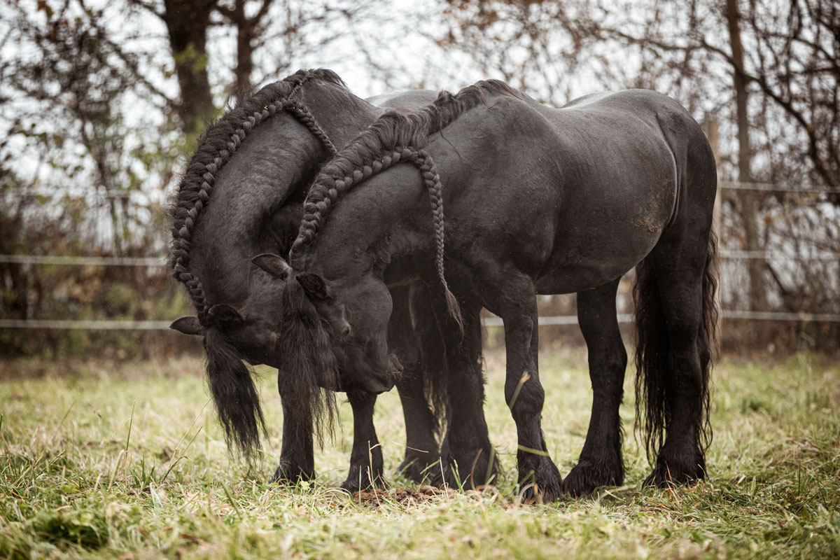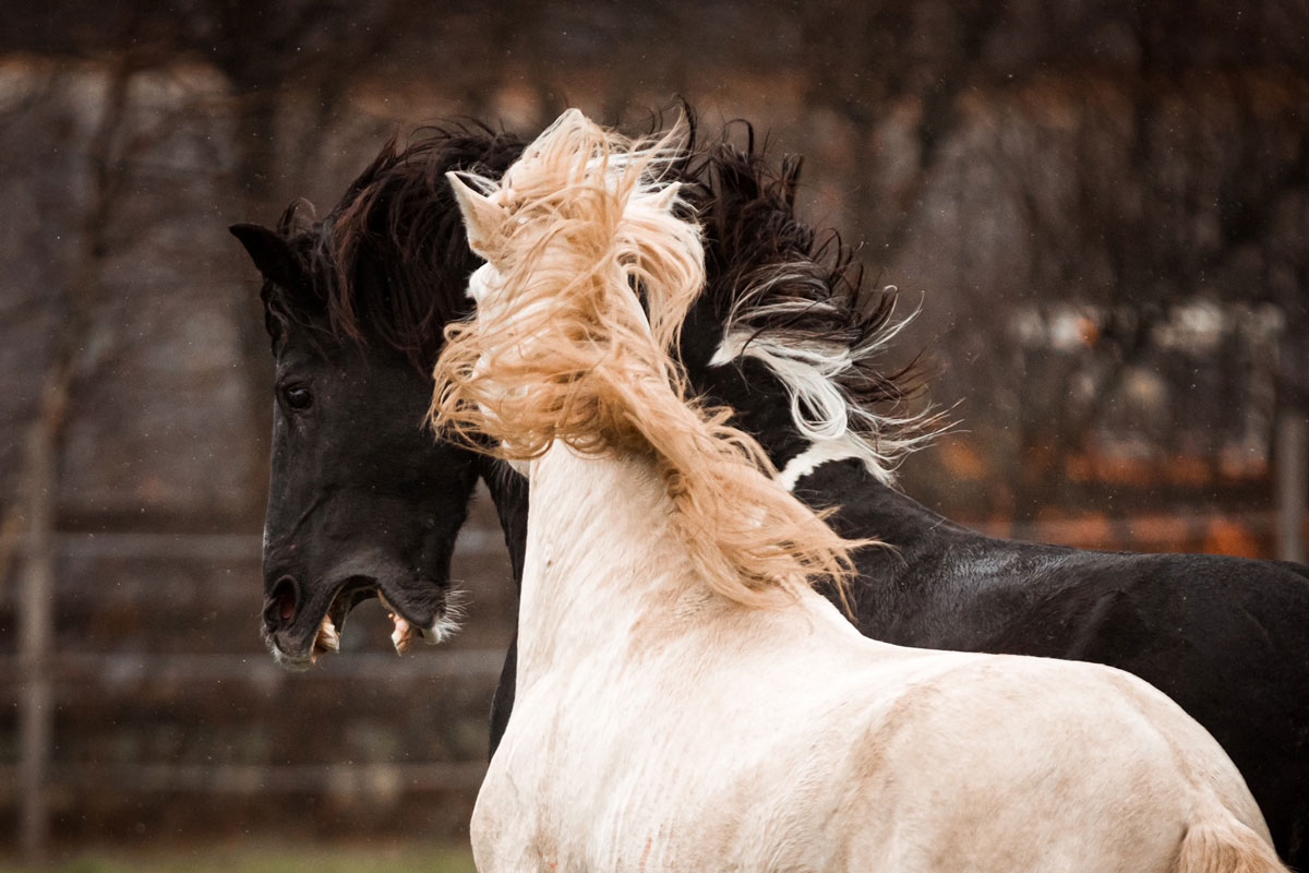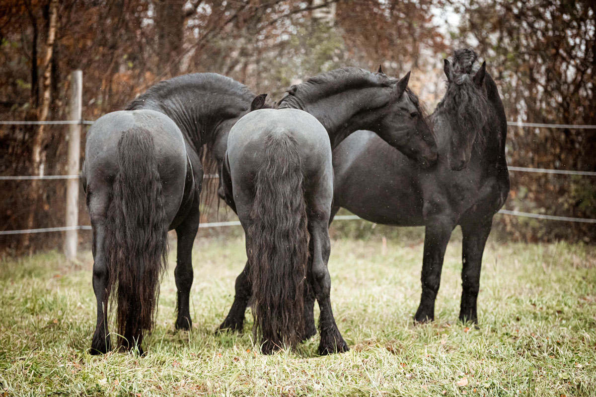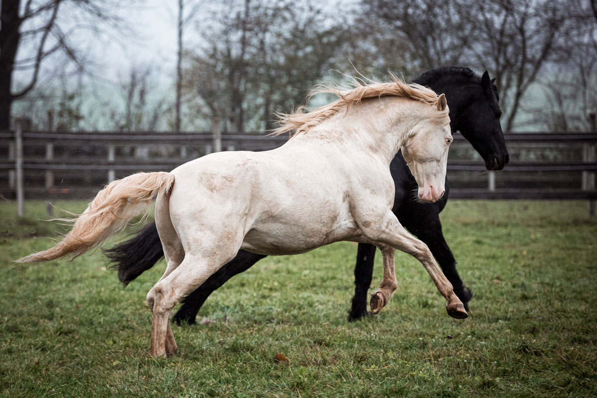 Die fünf Hengste (Django, Oceano, Rein, Da Vinci und Camacho) haben bei kalten Temperaturen, Nieselregen und Wind richtig Spaß auf der Koppel.
