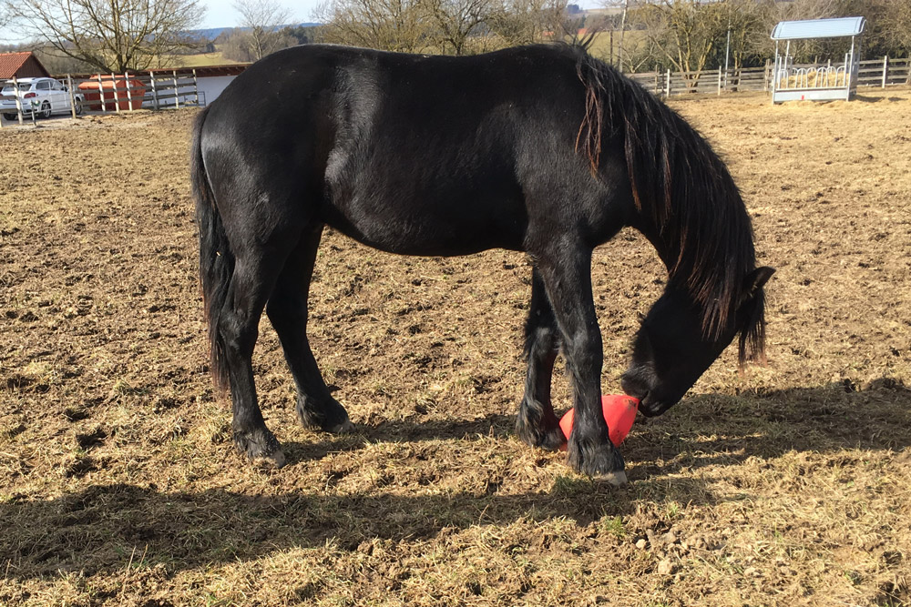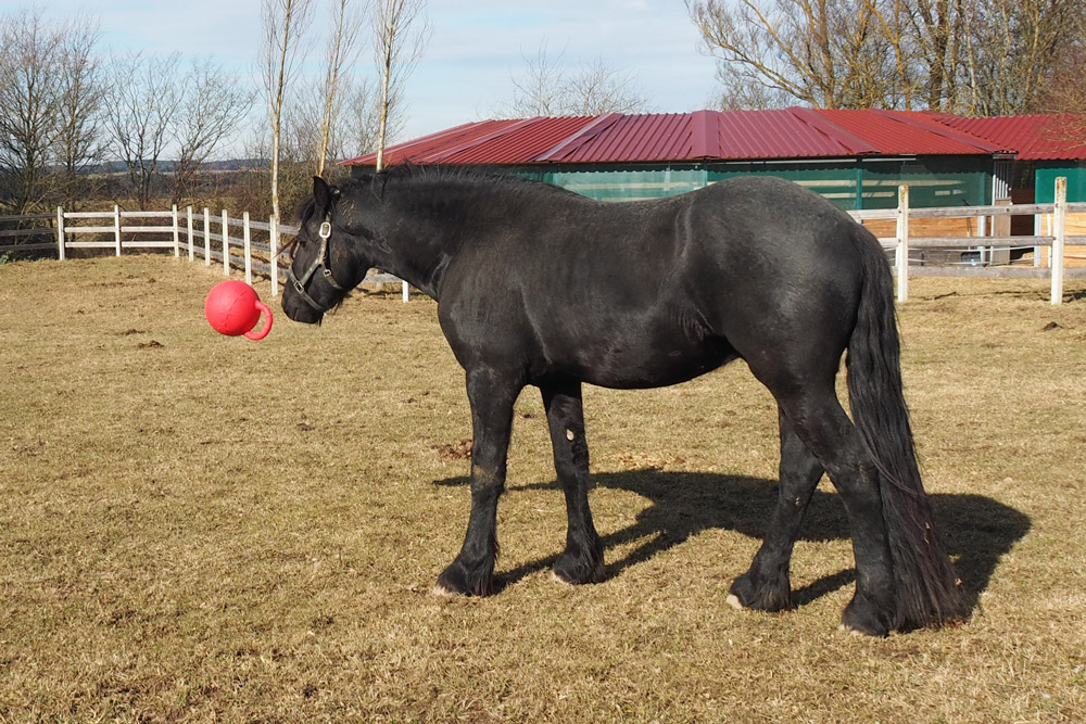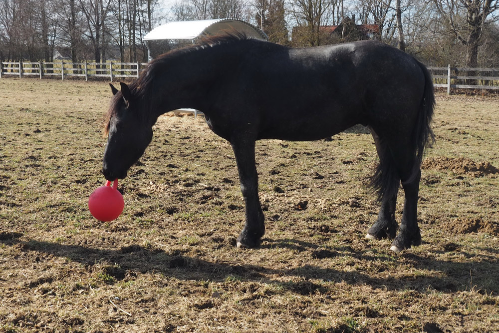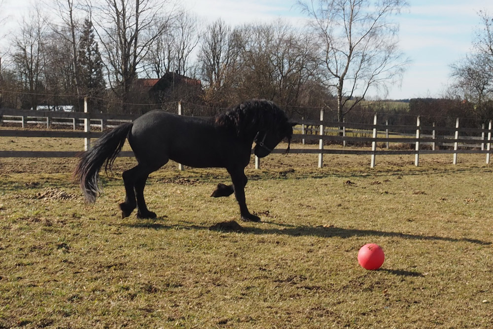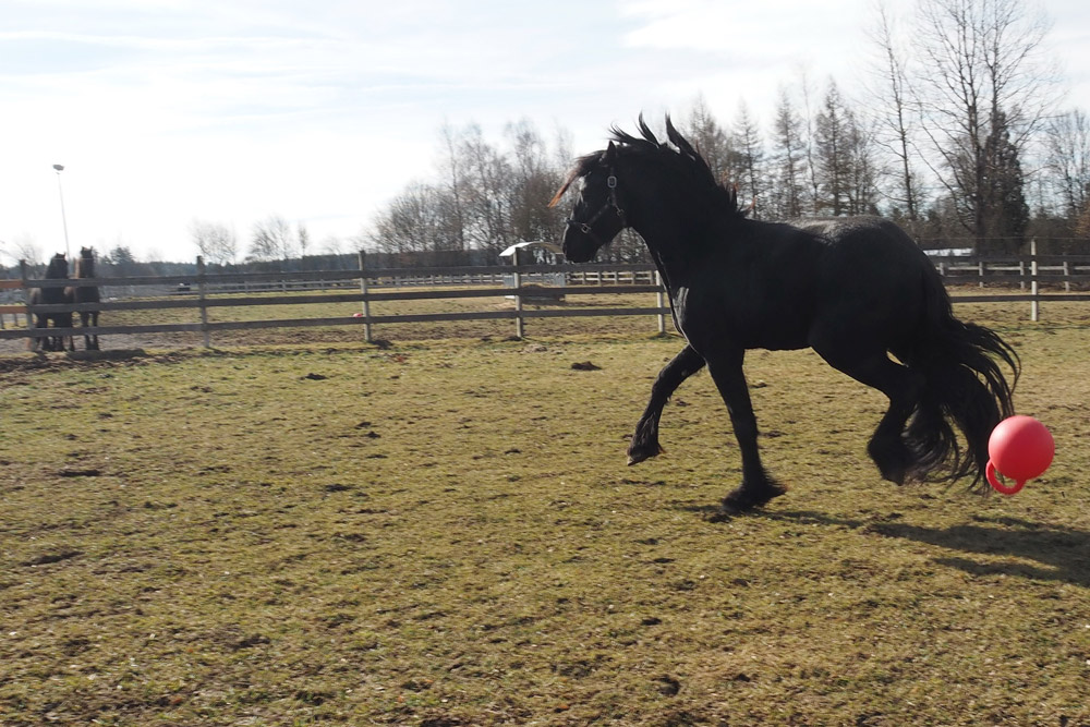 Damit es den Jungs auf den leider noch kargen Koppeln nicht "langweilig" wird, wird auch für Abwechslung gesorgt. Egal ob großer Karton, ausgediente Christbäume oder Bälle, alles wird mit großer Neugier angenommen.