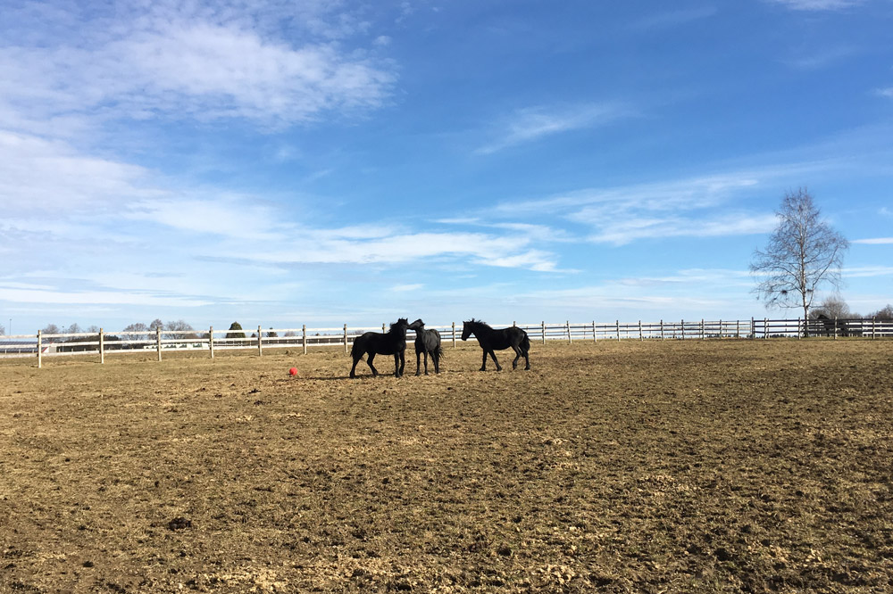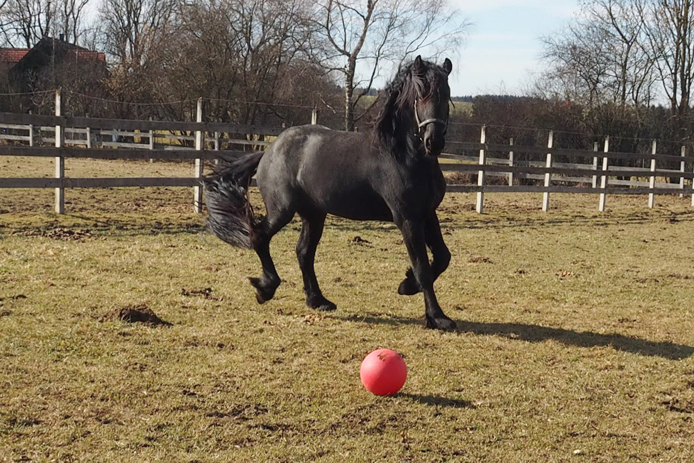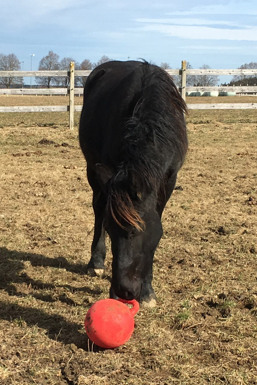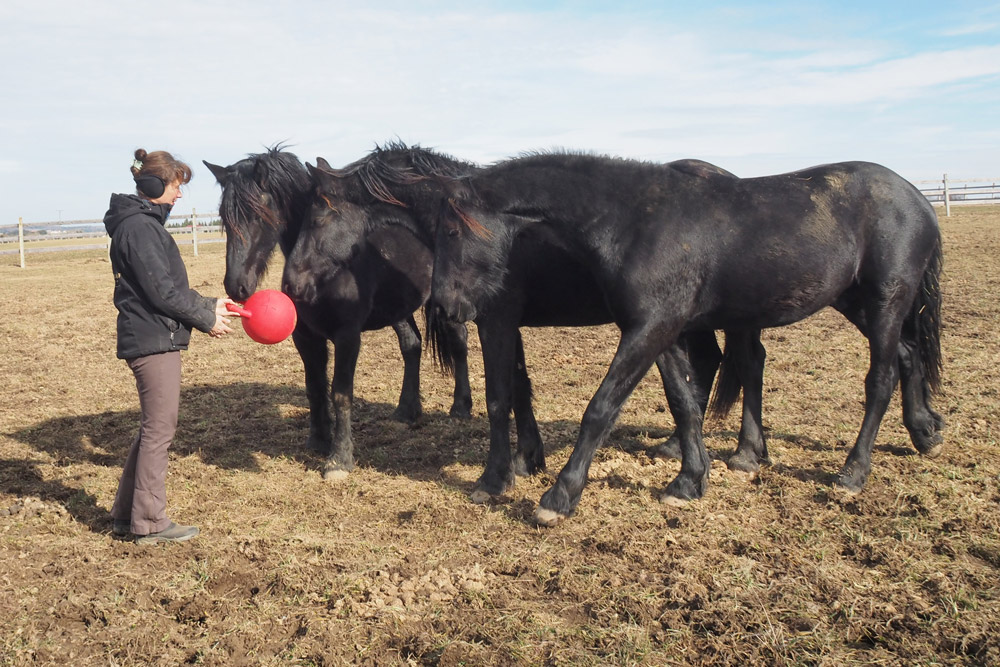 Damit es den Jungs auf den leider noch kargen Koppeln nicht "langweilig" wird, wird auch für Abwechslung gesorgt. Egal ob großer Karton, ausgediente Christbäume oder Bälle, alles wird mit großer Neugier angenommen.