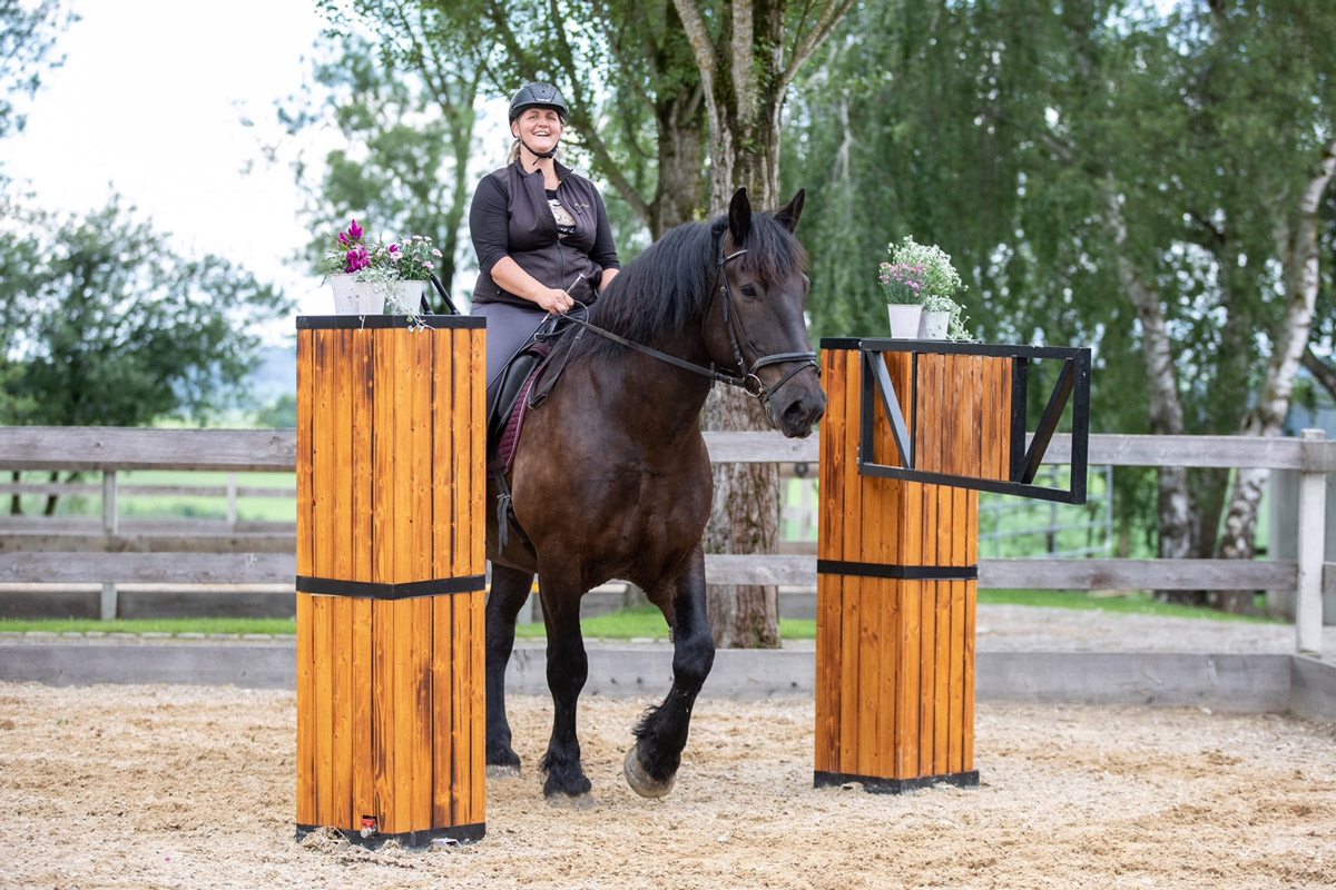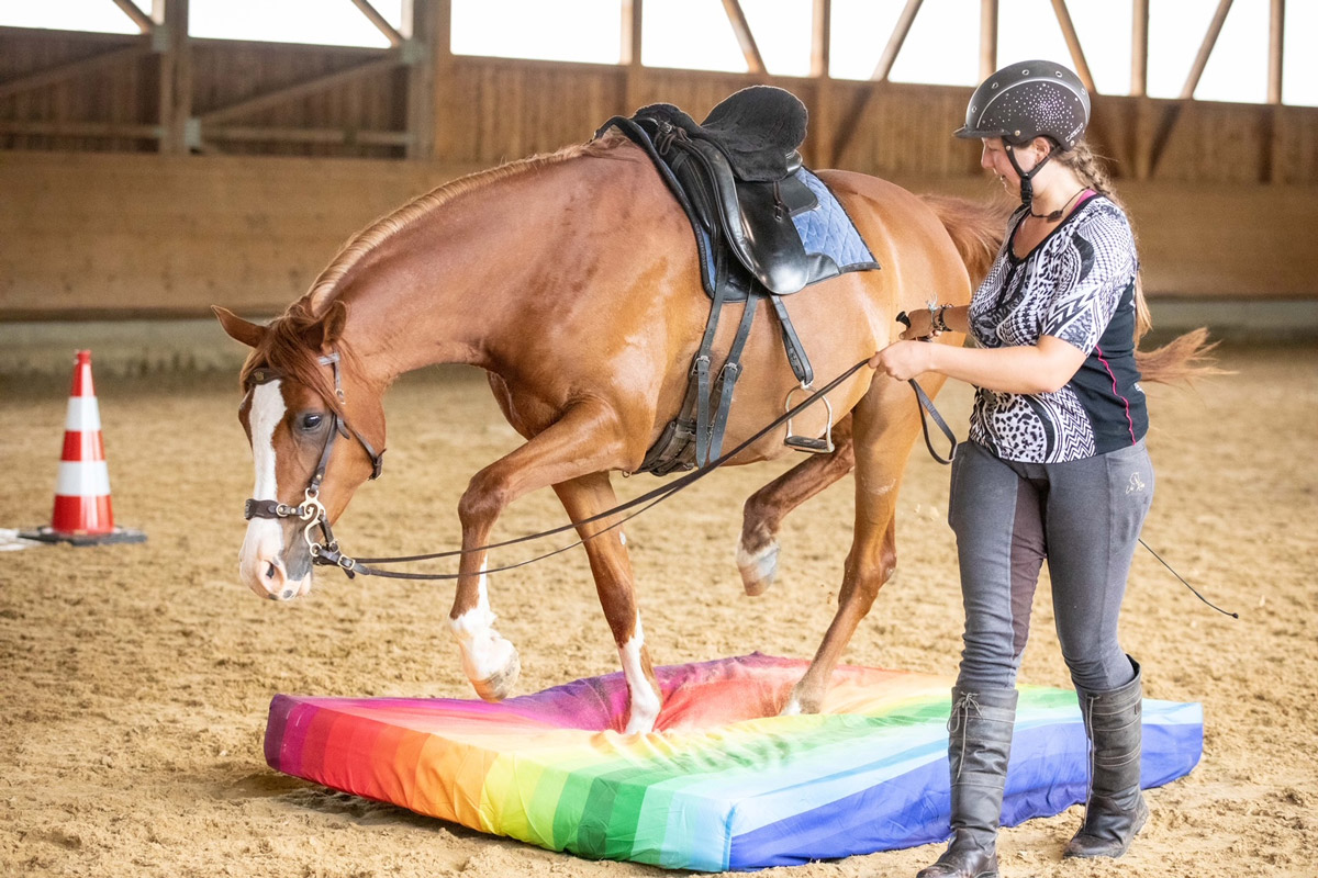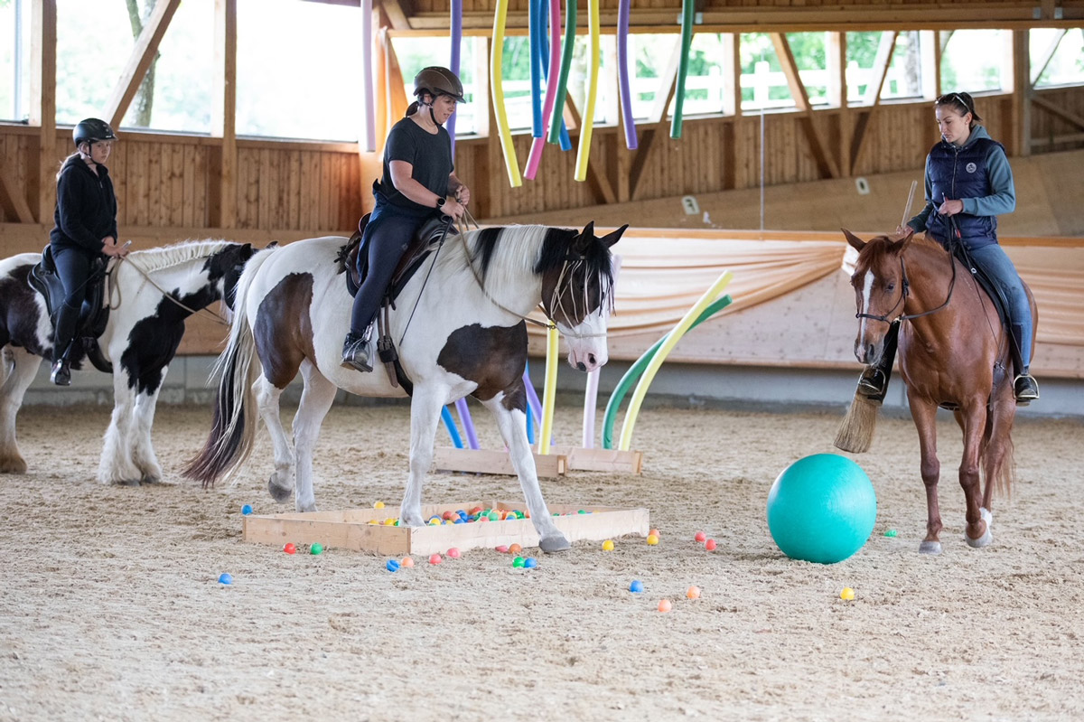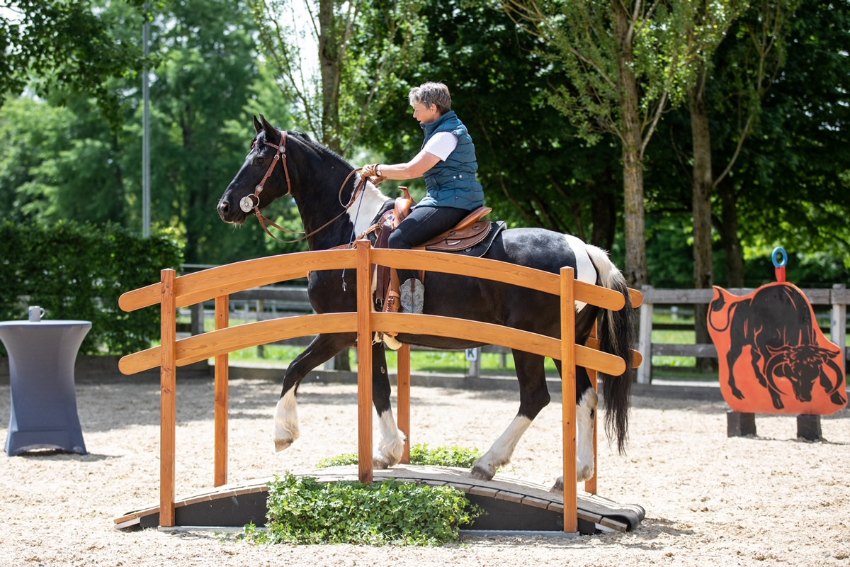 Den Teilnehmen standen auf dem Reitpatz Working Equitation Stationen zur Verfügung. Auf unserem Longierplatz waren Trabstangen und kleine Sprünge. In der Reithalle waren verschiedene Möglichkeiten zum Gelassenheitstraining aufgebaut und wie jedes Jahr war für viele das Highlight unser Natur Trail Park. Dort natürlich ganz besonders unser Teich.