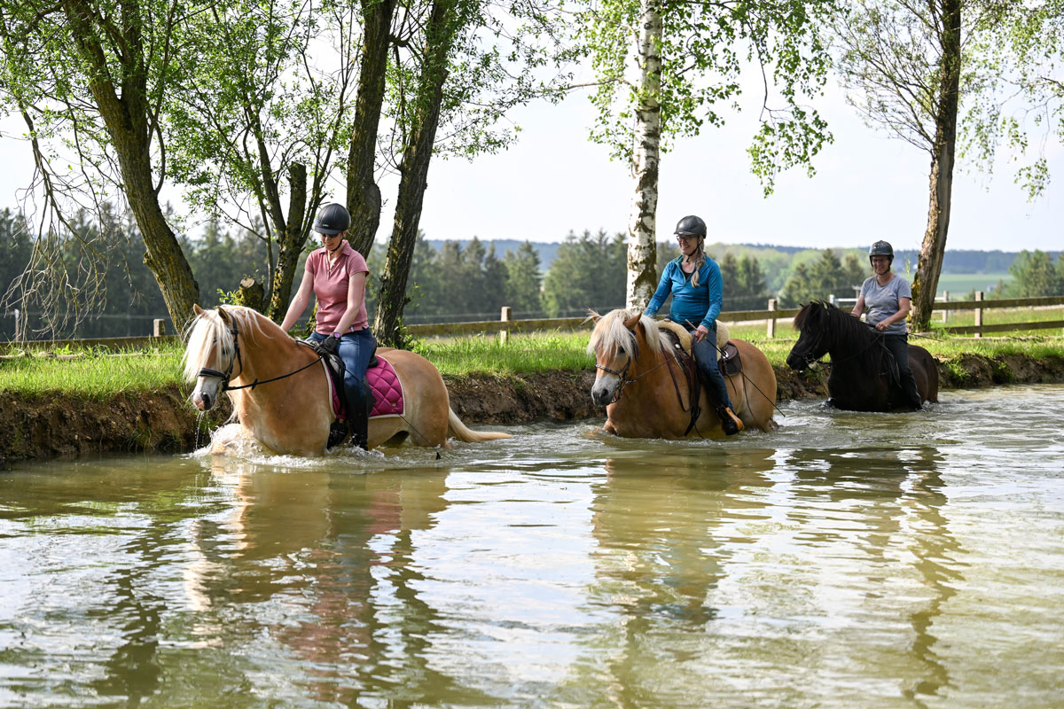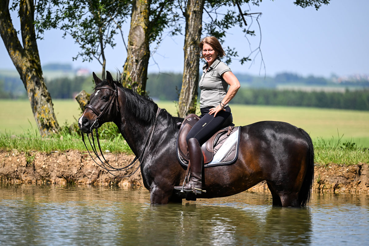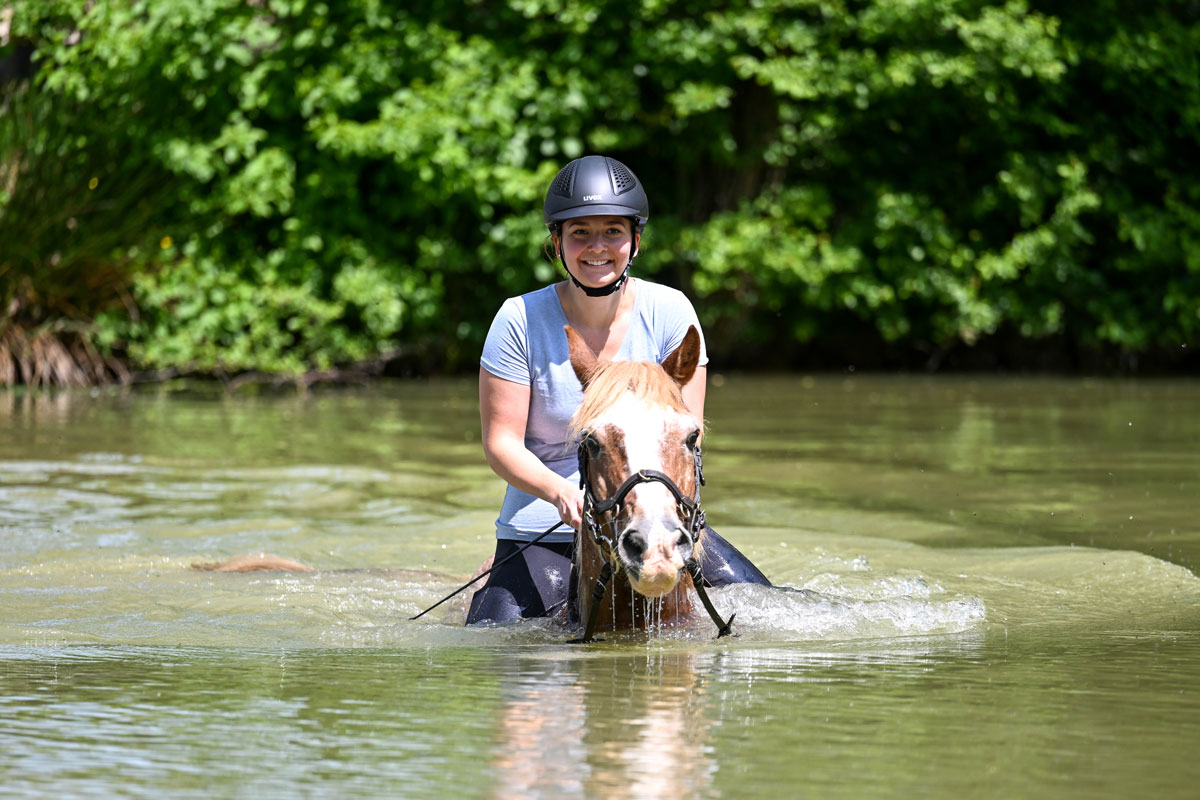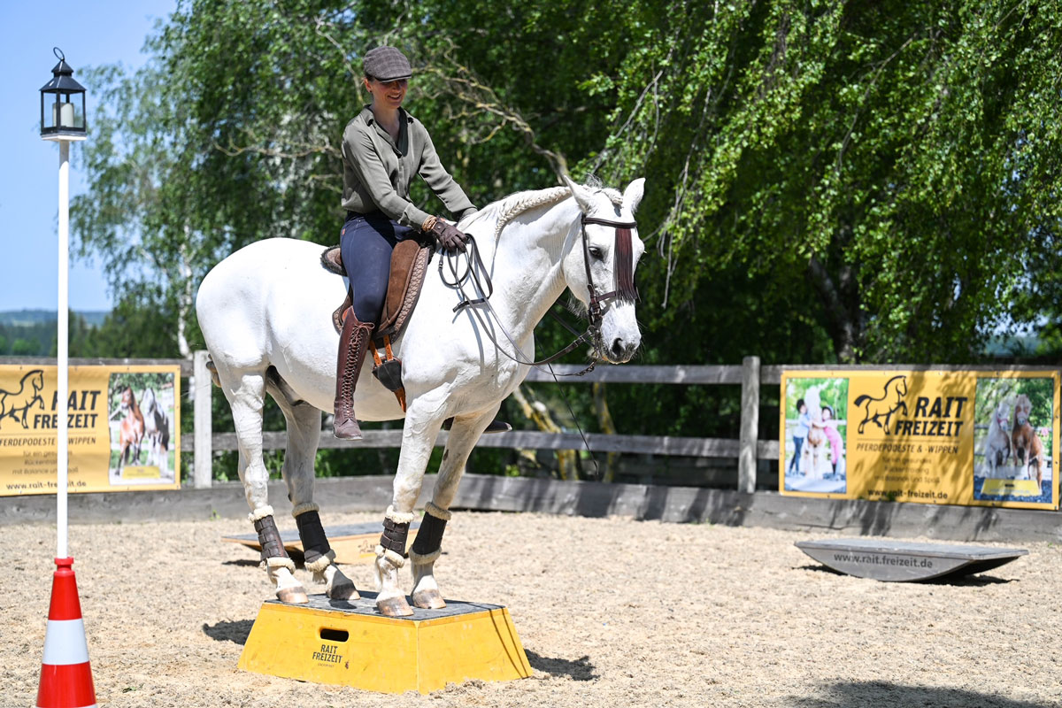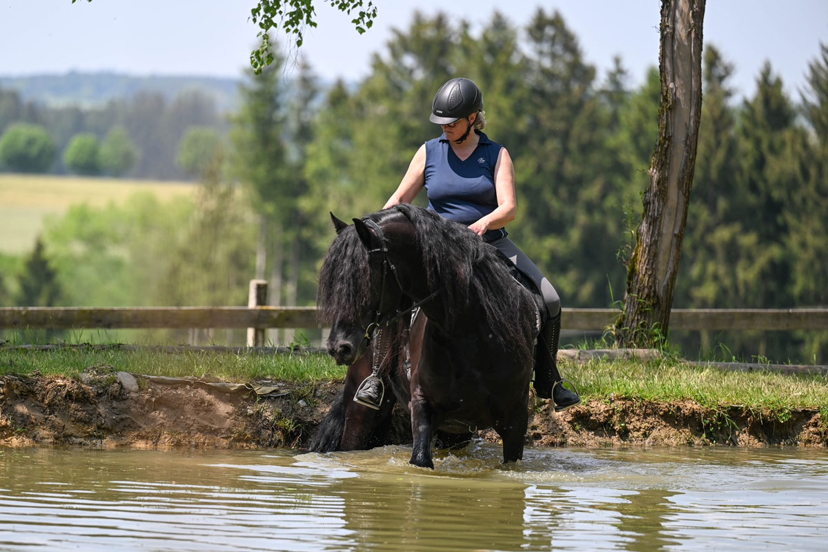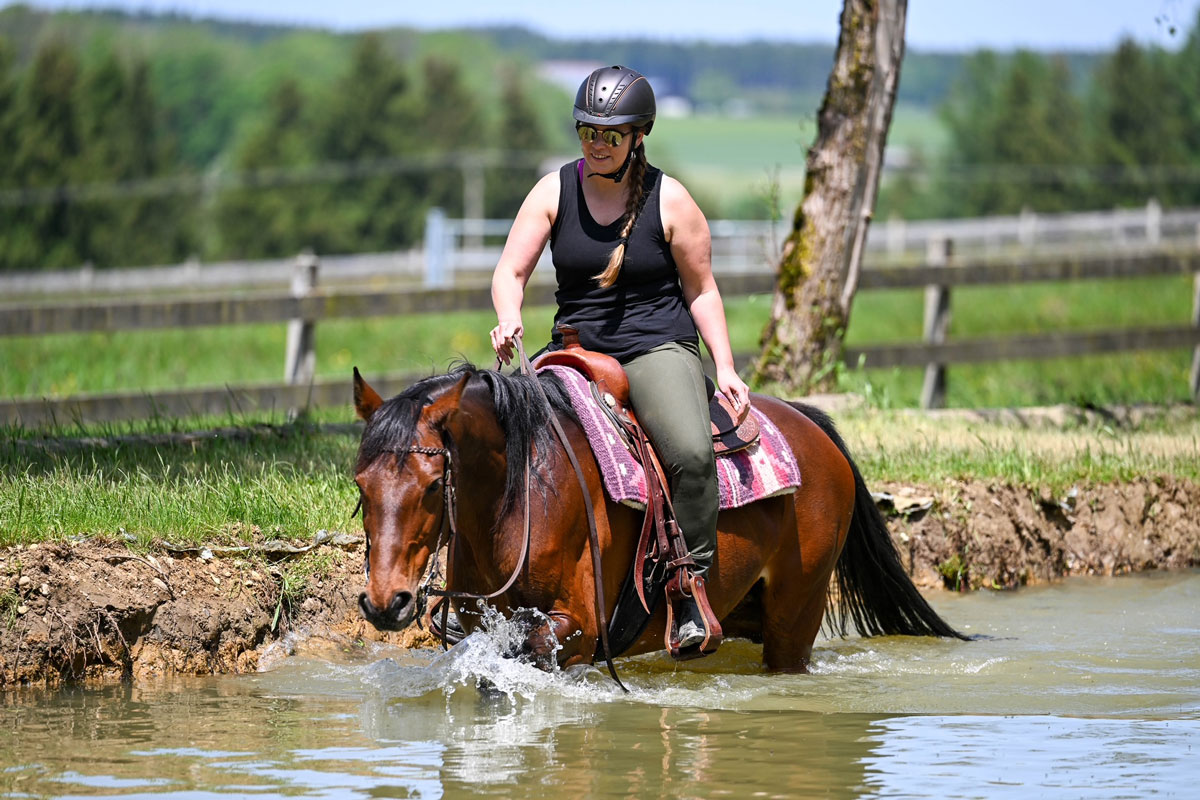 8 fabelhafte Tage „freie Trailwoche" liegen hinter uns. Den 157 Reiter/Pferd Paaren, vom süßen Shetty bis hin zum mächtigen Kaltblut, wurde einiges geboten: in unserer Reithalle gab es allerlei zum Thema Gelassenheitstraining, auf dem Dressurplatz waren verschiedene Stationen eines Working Equitation Trails aufgebaut und auf dem kleinen Platz waren Breitensportelemente, Wippen und Podeste zu finden. Für die meisten Reiterpaare war allerdings unser Natur Trail das Highlight und da ganz besonders (wie jedes Jahr) unser Teich. Die strahlenden Gesichter und die durchweg positiven Reaktionen auf diese Veranstaltung und dass sich viele schon für August angemeldet haben freut uns sehr, denn solche Tage sind für meine drei Mitarbeiterinnen auch mit viel Arbeit und Überstunden verbunden, denn schließlich muss auch der ganz normale Alltag auf dem Hof so nebenbei gestemmt werden.