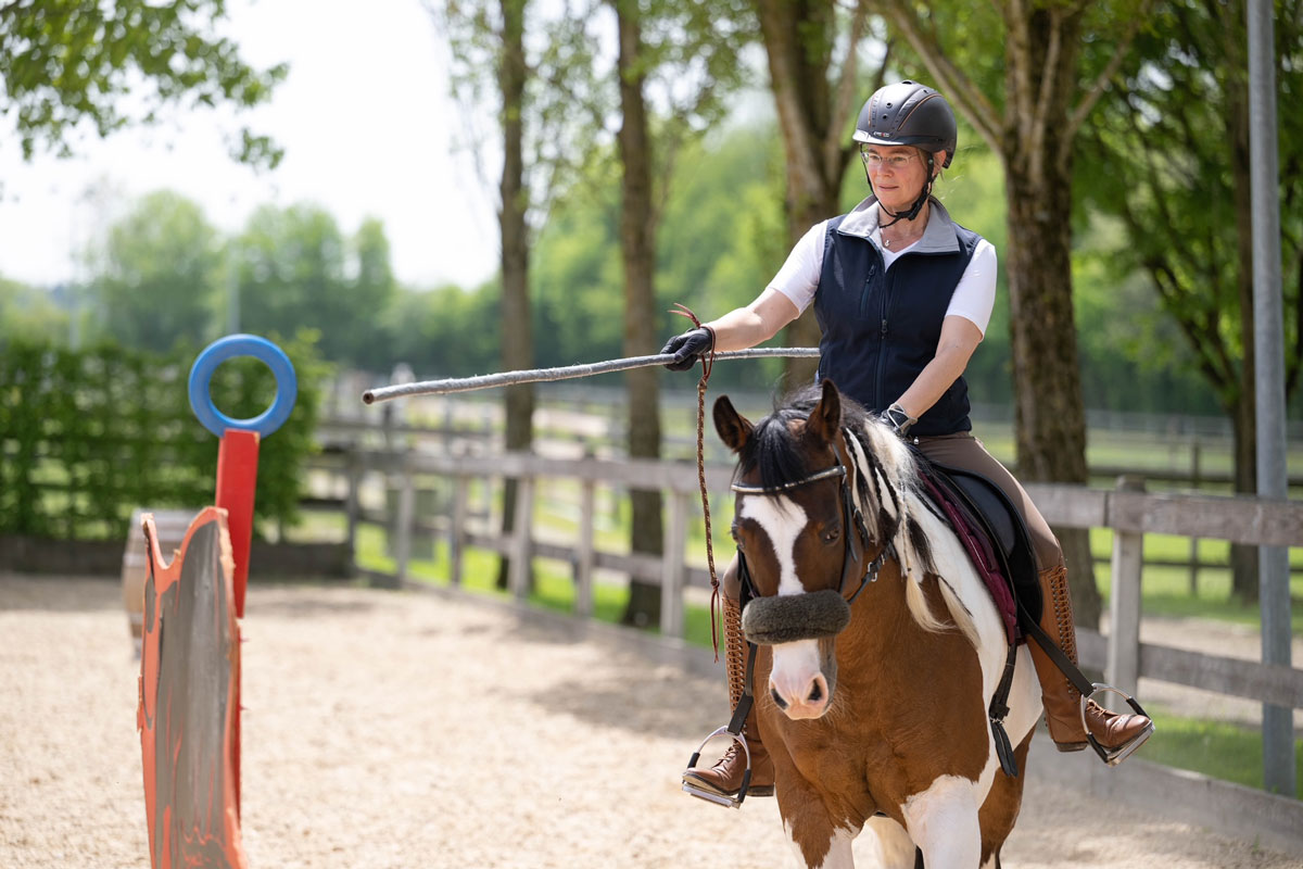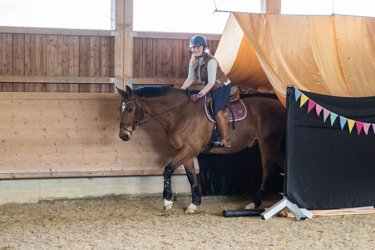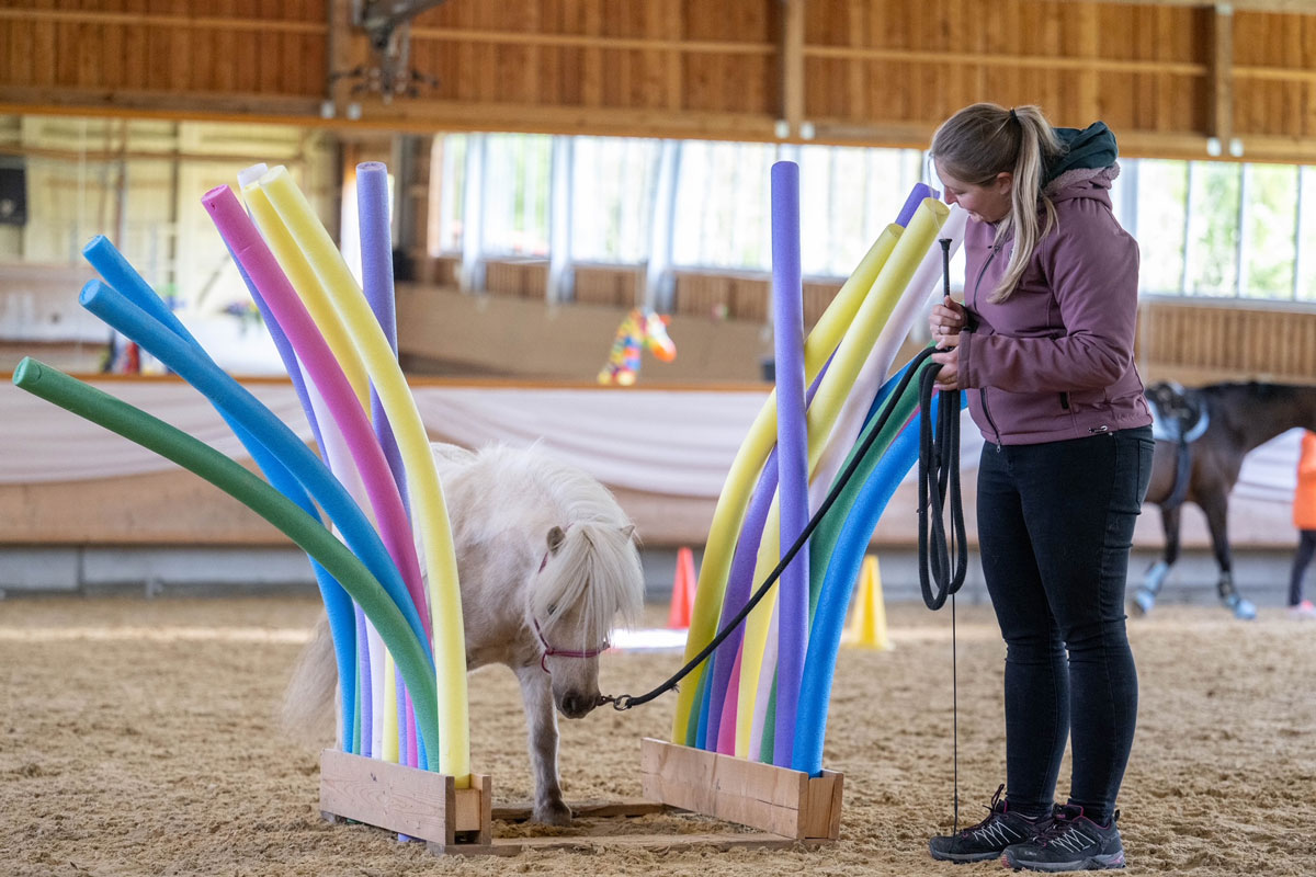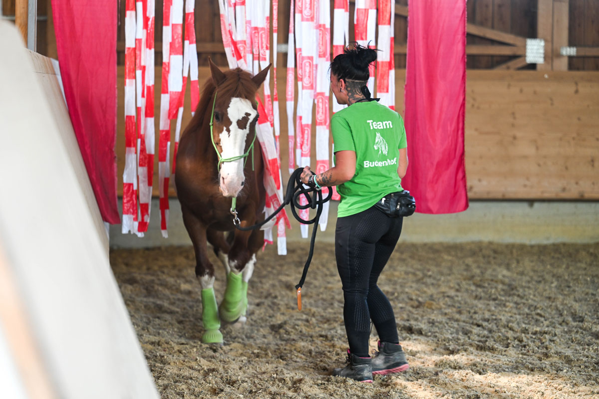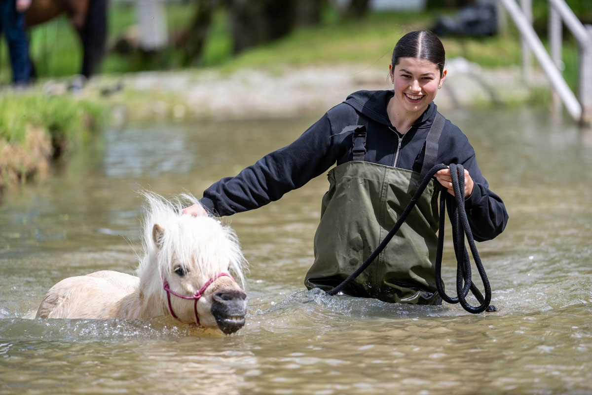 8 fabelhafte Tage „freie Trailwoche" liegen hinter uns. Den 157 Reiter/Pferd Paaren, vom süßen Shetty bis hin zum mächtigen Kaltblut, wurde einiges geboten: in unserer Reithalle gab es allerlei zum Thema Gelassenheitstraining, auf dem Dressurplatz waren verschiedene Stationen eines Working Equitation Trails aufgebaut und auf dem kleinen Platz waren Breitensportelemente, Wippen und Podeste zu finden. Für die meisten Reiterpaare war allerdings unser Natur Trail das Highlight und da ganz besonders (wie jedes Jahr) unser Teich. Die strahlenden Gesichter und die durchweg positiven Reaktionen auf diese Veranstaltung und dass sich viele schon für August angemeldet haben freut uns sehr, denn solche Tage sind für meine drei Mitarbeiterinnen auch mit viel Arbeit und Überstunden verbunden, denn schließlich muss auch der ganz normale Alltag auf dem Hof so nebenbei gestemmt werden.