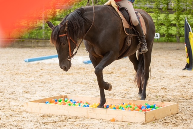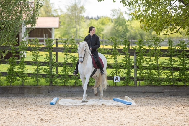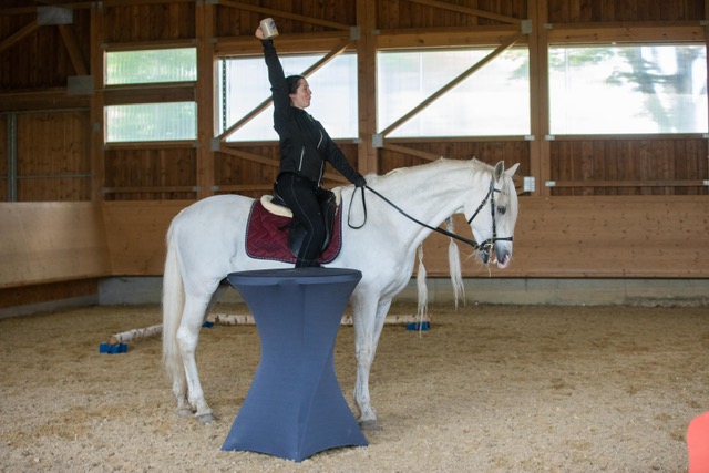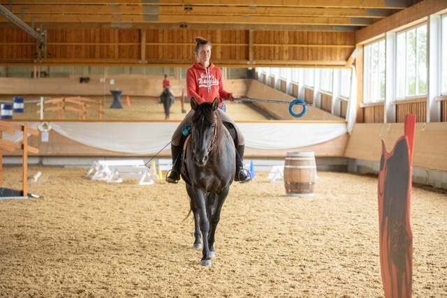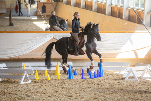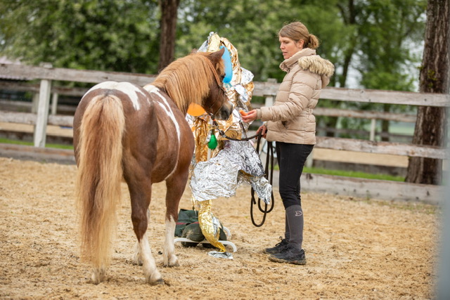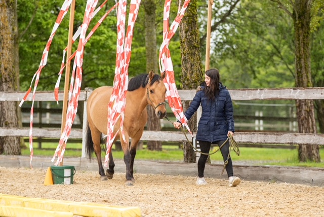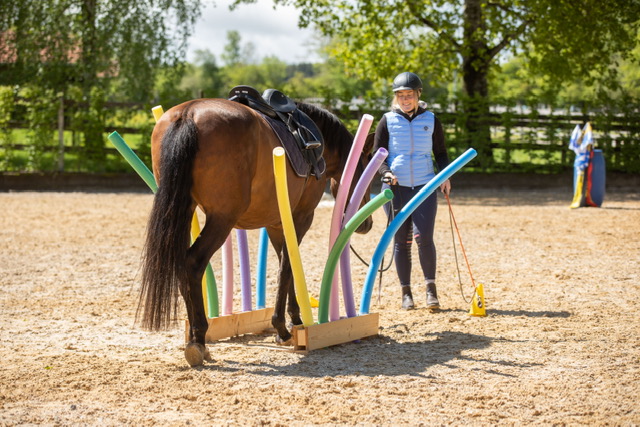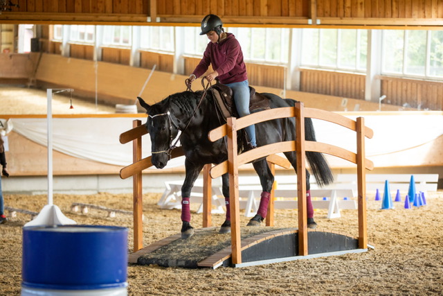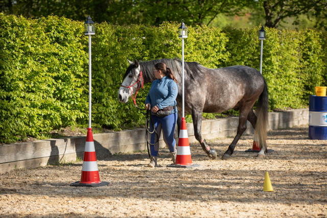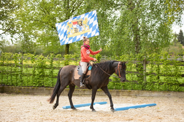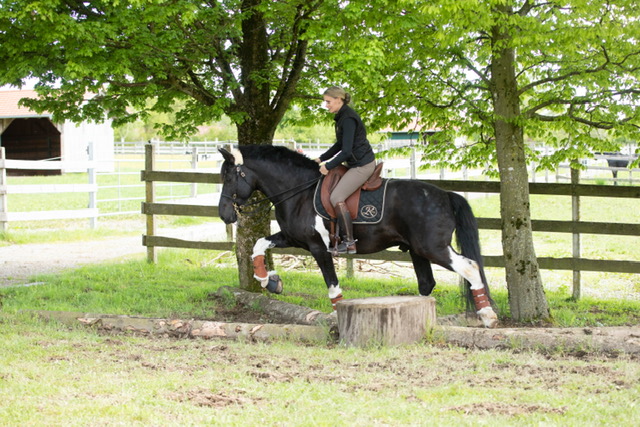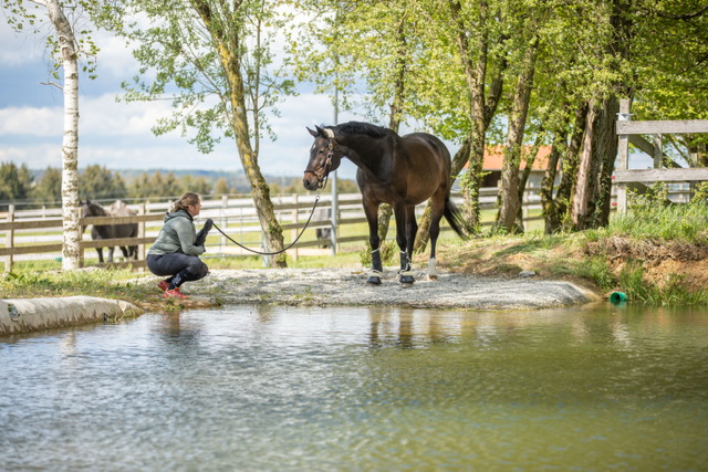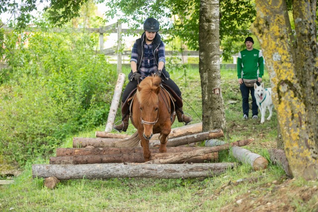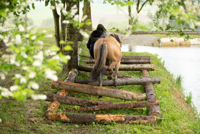 Fünf fabelhafte Tage „freie Trailwoche“ liegen hinter uns. Rechtzeitig zu dieser Veranstaltung rutschte der Inzidenzwert kräftig nach unten und der Wettergott war uns auch (bis auf einen nassen Ausrutscher) wohl gesonnen. Den 2- und 4-beinigen Teilnehmern, vom 20 jährigen Shetty, über den Lusitanohengst bis hin zum mächtigen Kaltblut, wurde einiges geboten: in unserer Reithalle waren die verschiedensten Stationen eines Working Equitation Trails aufgebaut, auf dem großen Reitplatz allerlei zum Thema Gelassenheitstraining und auf dem kleinen Platz waren Breitensportelemente zu finden. Für die meisten Reiterpaare war allerdings unser Natur Trail das Highlight und da ganz besonders (wir letztes Jahr auch) unser Teich. Die strahlenden Gesichter und die durchweg positiven Reaktionen auf diese Veranstaltung und dass sich viele schon für August angemeldet haben freut uns sehr, denn sie ist für meine „Mädels“ auch mit viel Arbeit und Überstunden verbunden und Anna hatte auch noch ein paar Hundert Fotos zu sichten und bearbeiten.