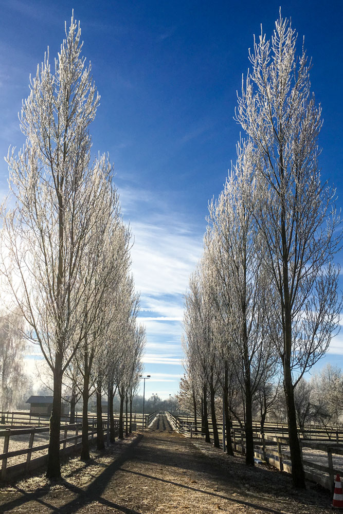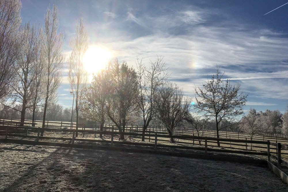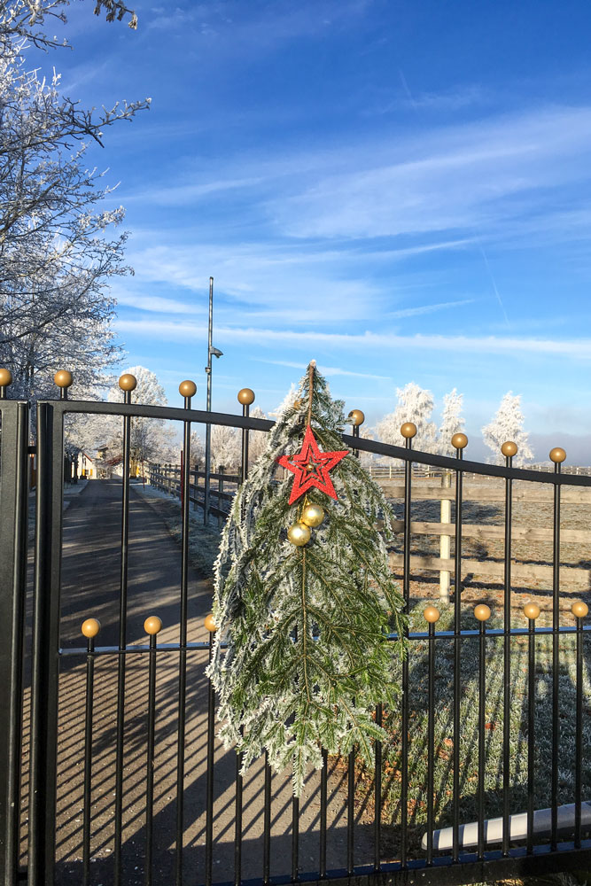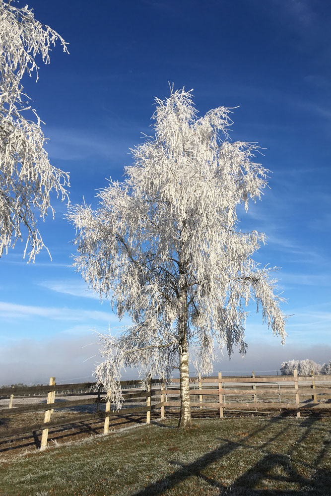 Kein Schnee in Sicht - dafür verzaubert der Frost unseren Hof in eine Märchenlandschaft. Mensch und Tier genießen die Sonne in vollen Zügen.