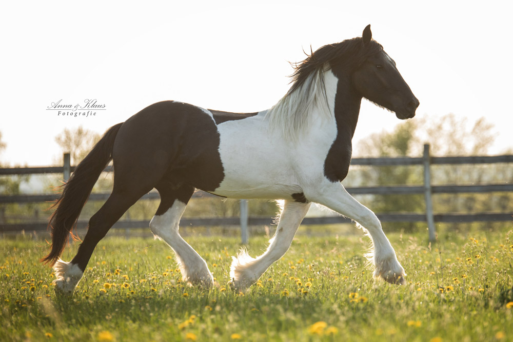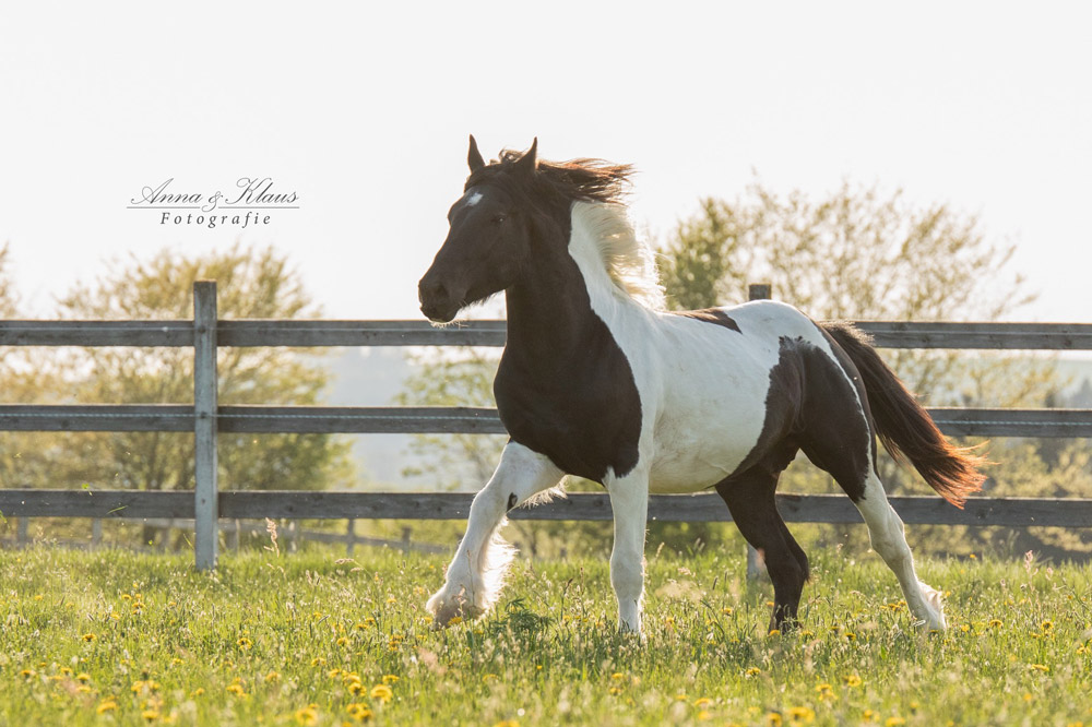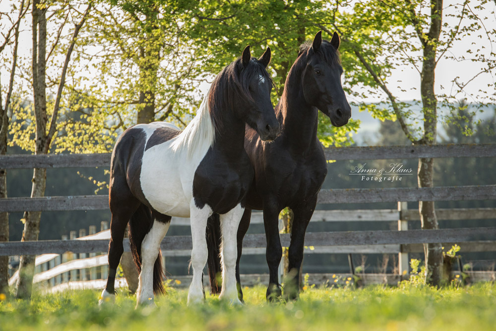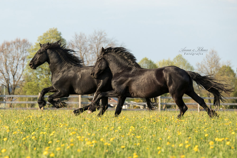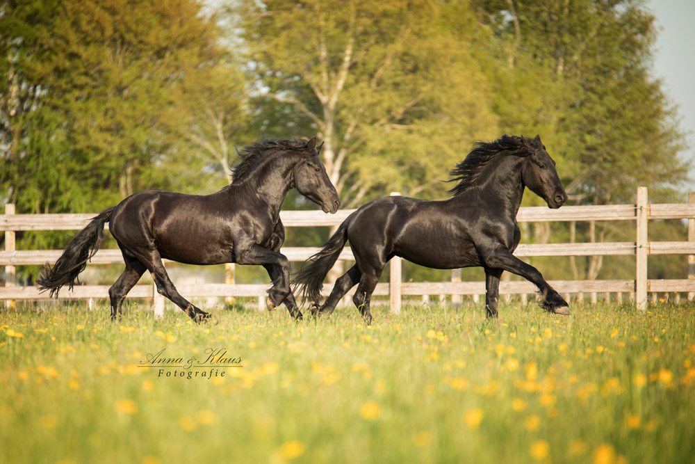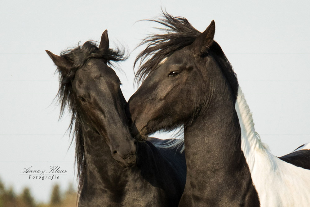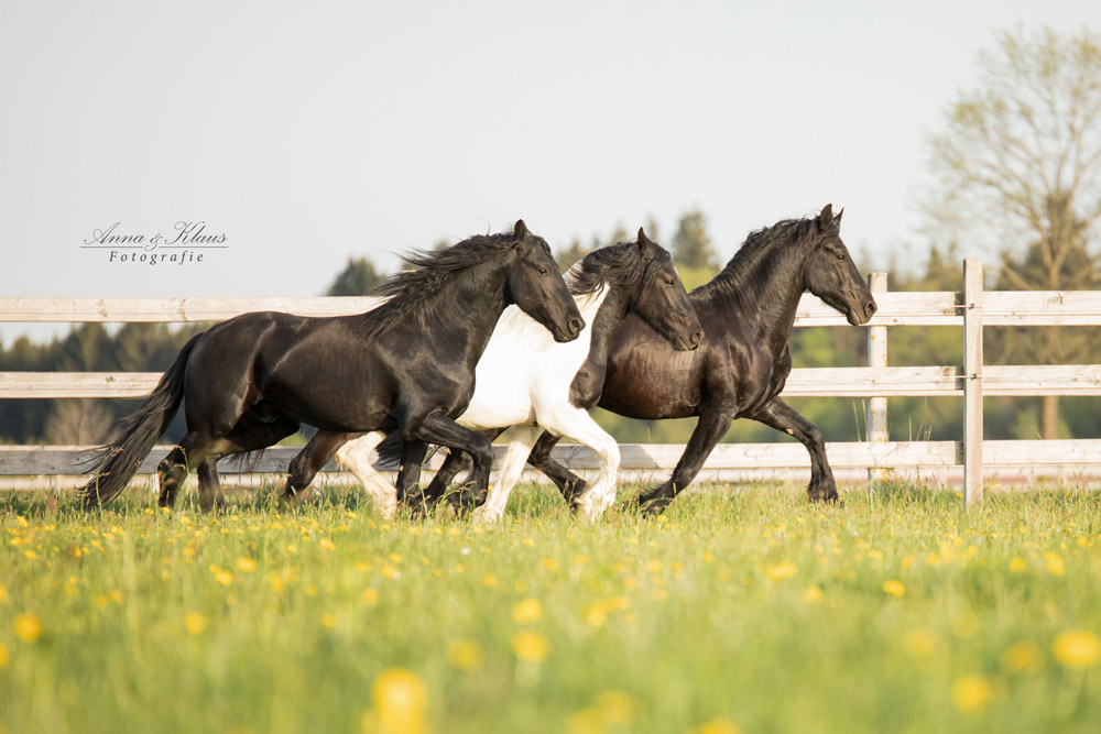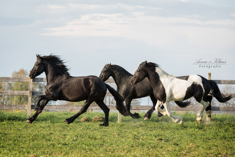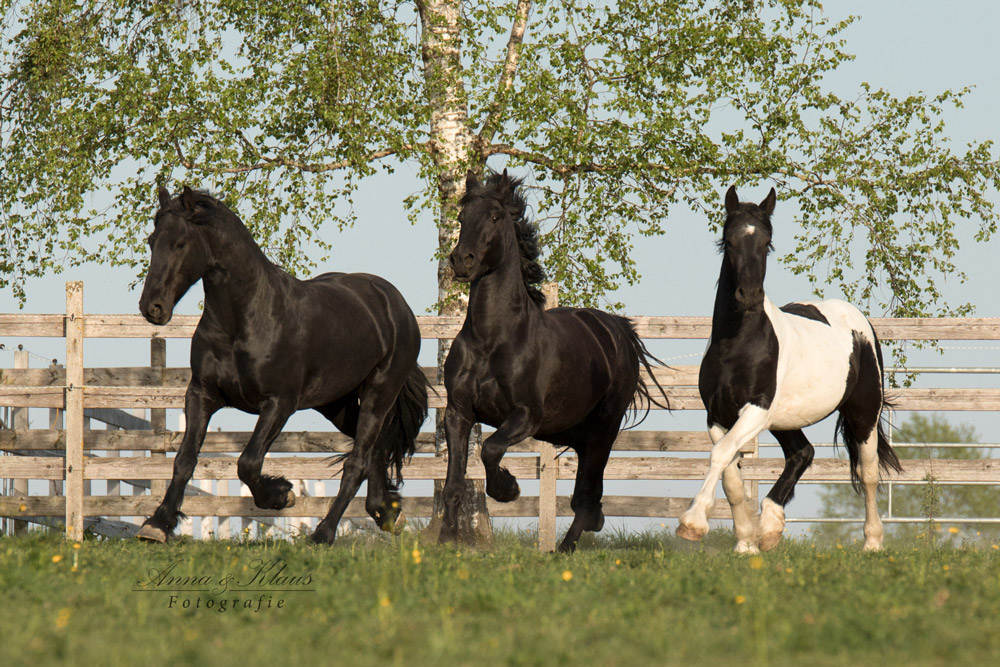 Spiel und Spaß genießen die zwei dreijährigen Friesenhengste Zip und Zorro zusammen mit unserem zweijährigen Barockpintohengst Neo auf der großen Sommerweide.